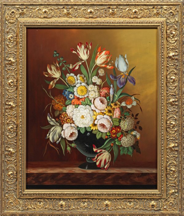 Prachtvolles Stillleben mit verschiedenen, bunten Sommerblühern und einem Schmetterling, arrangiert auf einer Steinplatte. Charakteristisches Werk Denners, der bei seinem Vater, dem bekannten Stilllebenmaler Oskar Robert Dogarth lernte und sich an den niederländischen Meistern des goldenen Zeitalters orientierte. Öl/Holzplatte. R. u. sign.; 60 cm x 50 cm. Rahmen.