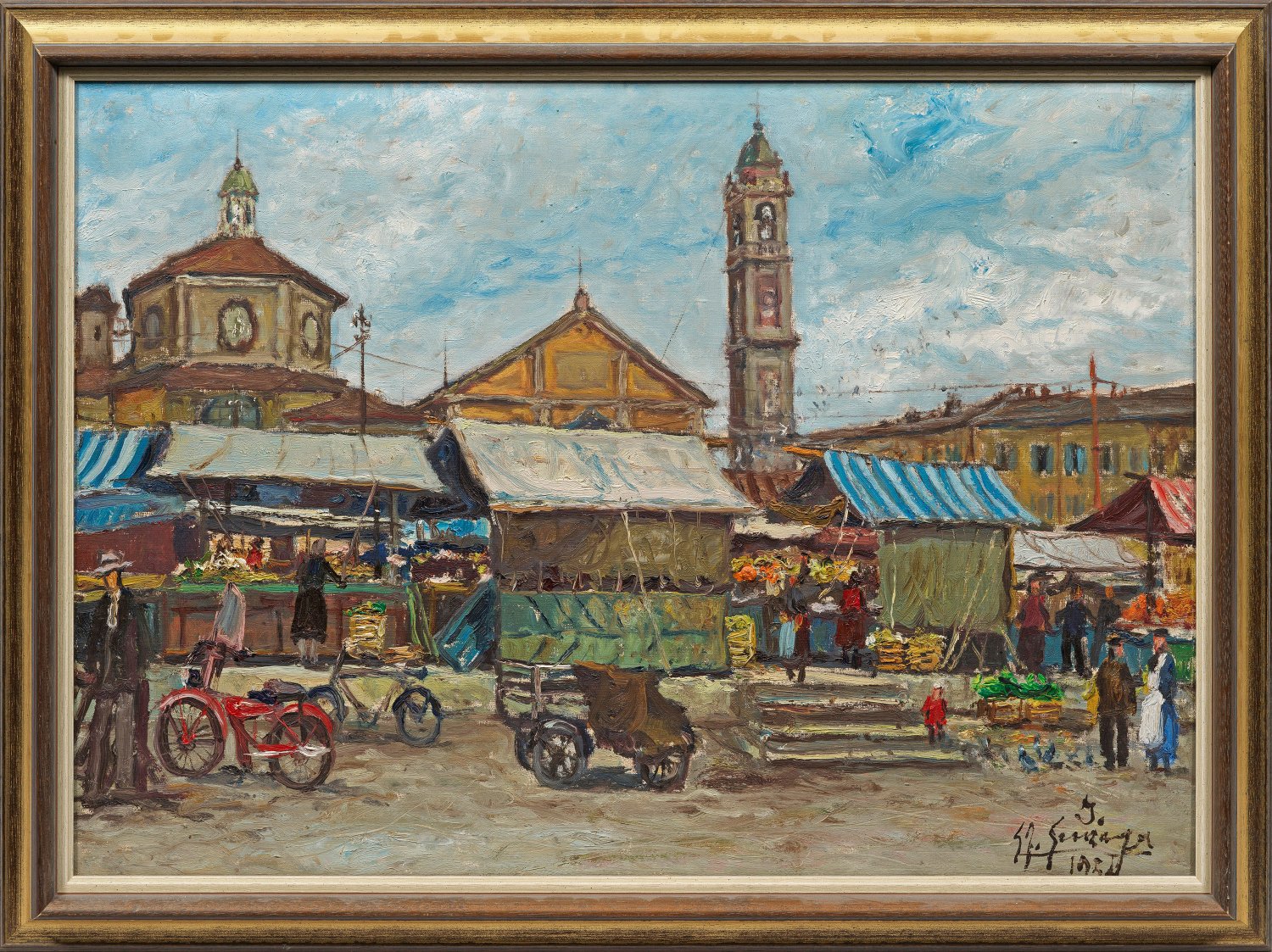 In leuchtendem Kolorit und kräftigem, pastosen Duktus gemalte Ansicht des belebten Wochenmarktes auf der Piazza Santo Stefano in Mailand. Öl/Lwd.; R. u. sign. und dat. 1954. Verso ebenfalls sign. und dat. 1954 sowie betitelt und mit Nr. 15. 49,5 cm x 69,5 cm. Rahmen.