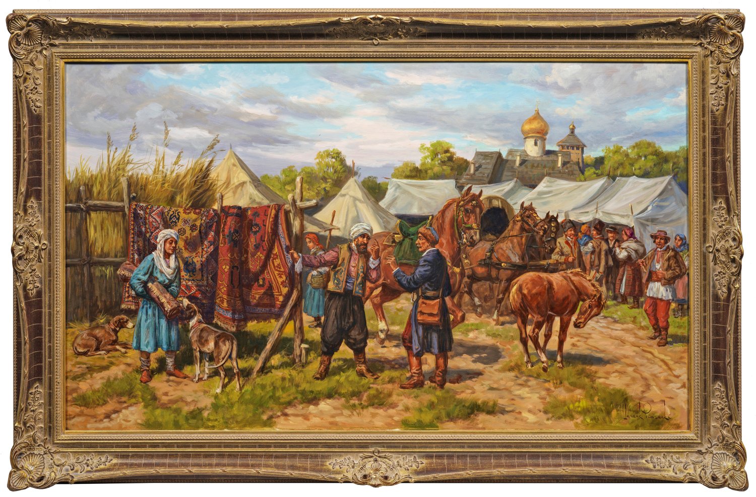 Nostalgische, vielfigurige Szene aus dem 19. Jh.; Piasecki malte mit Vorliebe Schlachten-, Reiter- und Pferdemotive, wie sie auch in diesem Gemälde wiederkehren. Er lernte und arbeitete in den Privatateliers von Stanislaw Batowski, Zygmunt Rozwadowski und Jerzy Kossak und studierte nach dem 2. Weltkrieg an der Krakauer Akademie. 1974 ging er mit seiner Familie nach Wien und richtete sich dort ein eigenes Atelier ein. Öl/Lwd.; 70 cm x 119 cm. Rahmen.