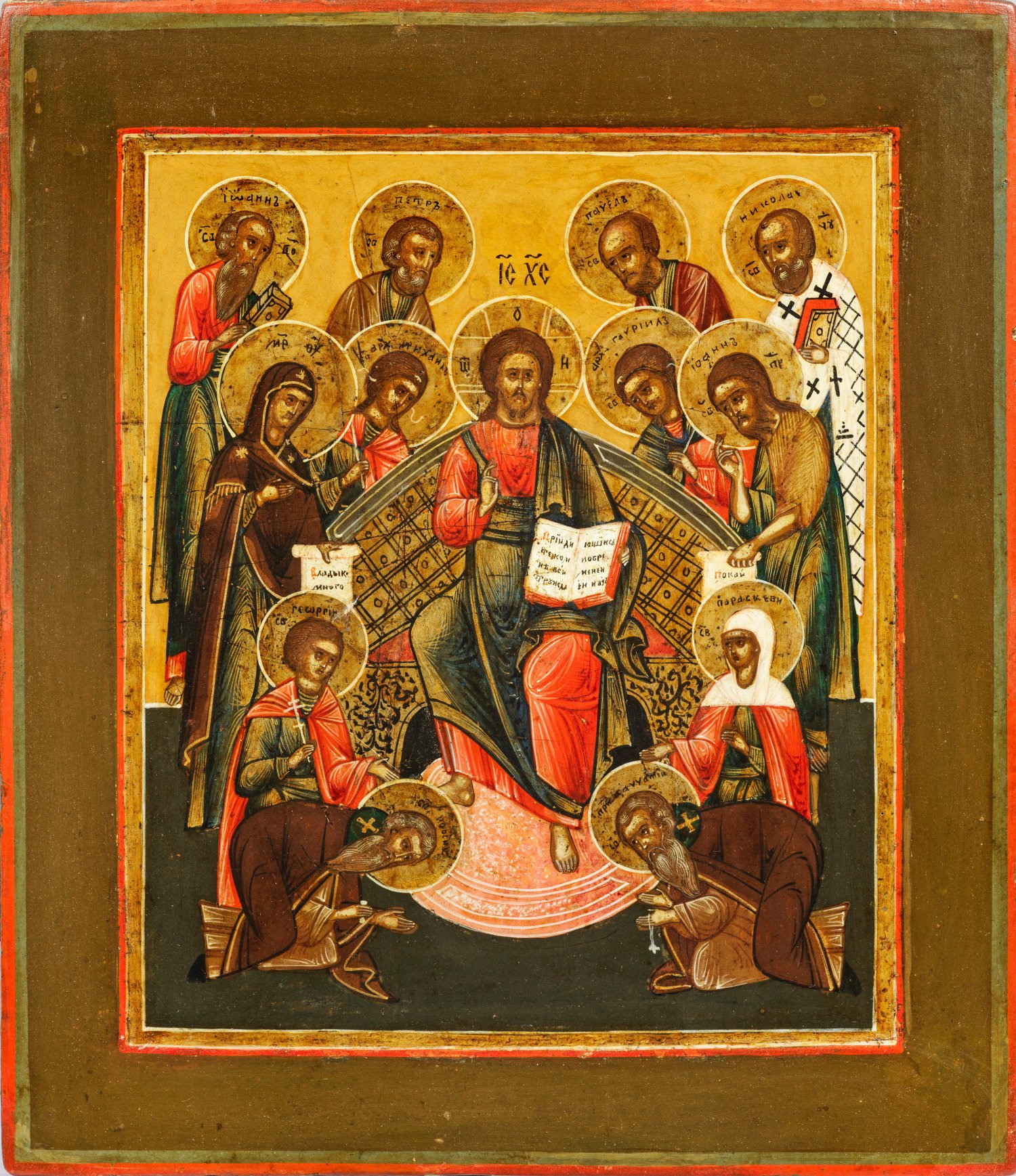 Tempera mit Gold auf Holz. Kowtscheg. Fein gemalte, zentrale Darstellung des Christus Pantokrator, umrahmt von zahlreichen Heiligen, flankiert von der Muttergottes links und Johannes dem Vorläufer rechts. Zu den Füßen Christis knien der Hl. Zosima und der Hl. Savatij. Kirchenslawisch bez.; 35,4 cm x 30 cm x 2,5 cm.