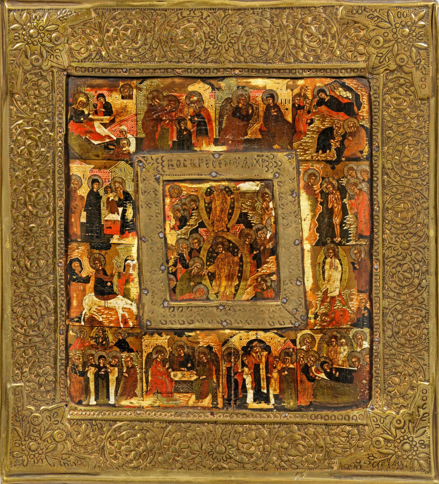 Tempera mit Gold auf Holz. Getriebenes Messingoklad. Im Bildzentrum die Darstellung des Ostergeschehens mit Höllenfahrt und Auferstehung, eingefasst von zwölf Illustrationen der wichtigsten Feste des orthodoxen Kirchenjahres. Kirchenslawisch bez.; Ca. 32,5 cm x 28 cm x 3 cm.