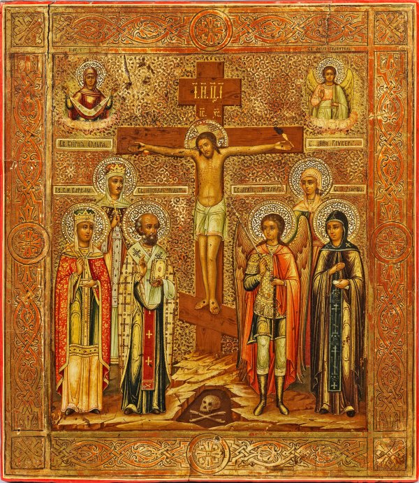 Tempera mit Goldgrund auf Holz. Zwei rücks. Sponki. Goldgrund fein punziert. Zentrale Darstellung der Kreuzigung Christi auf Golgatha, flankiert von sechs Heiligen. Am Fuße des Kreuzes liegender Schädel Adams. Die Szene wird bekrönend flankiert von der Gottesmutter mit Schleiertuch und dem Erzengel Michael. 31,5 cm x 26,5 cm x 2,5 cm.
