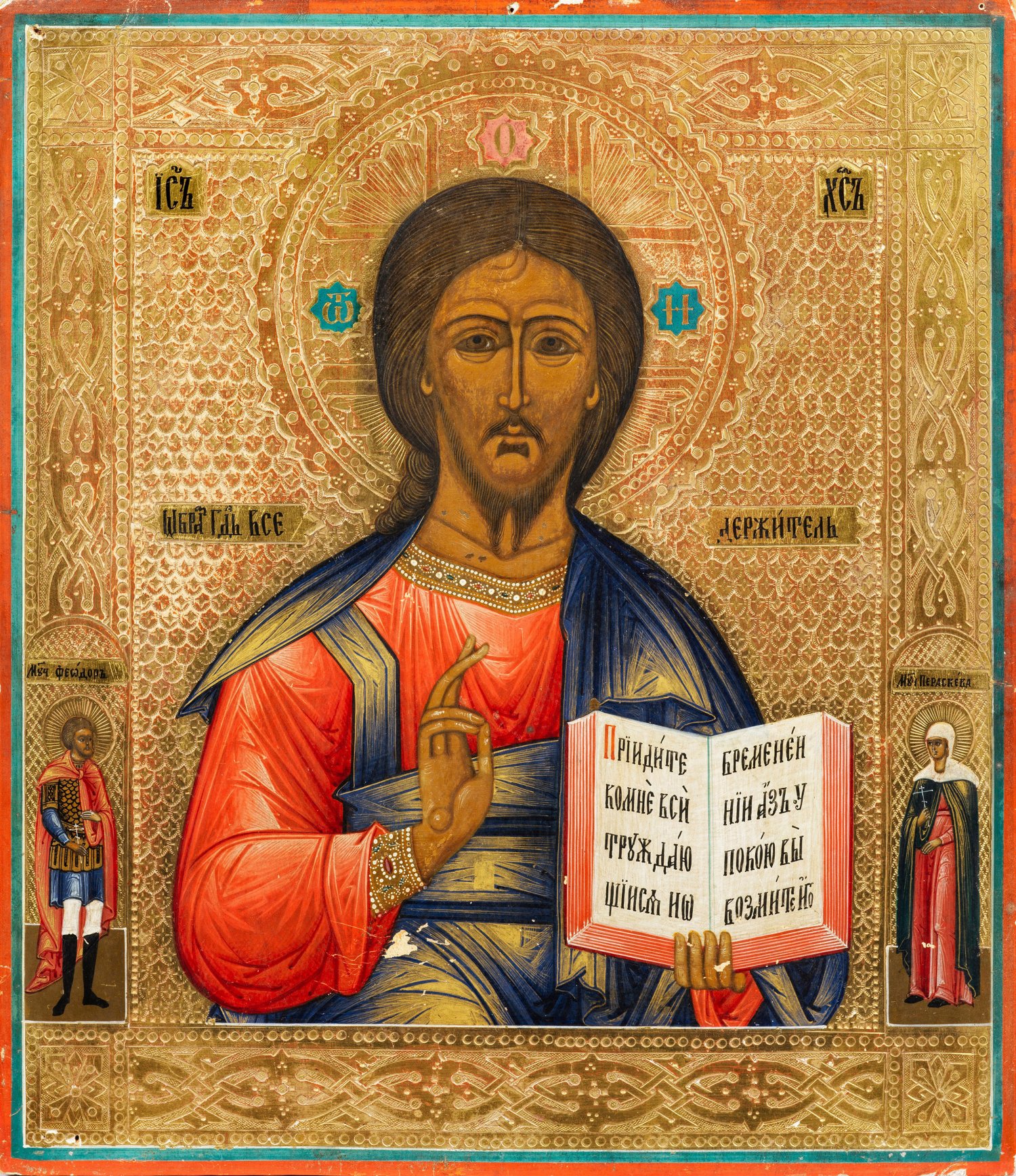 A Russian icon depicting "Christ Pantocrator". Tempera with gold on wood.