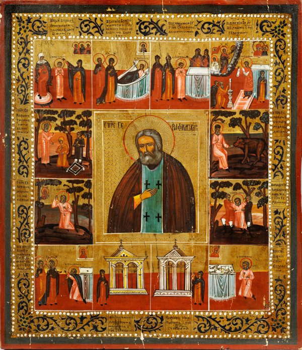 A large Russian icon depicting Seraphim of Sarov and life scenes. Tempera with gold on wood.
