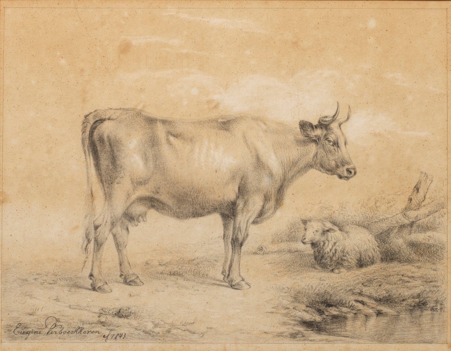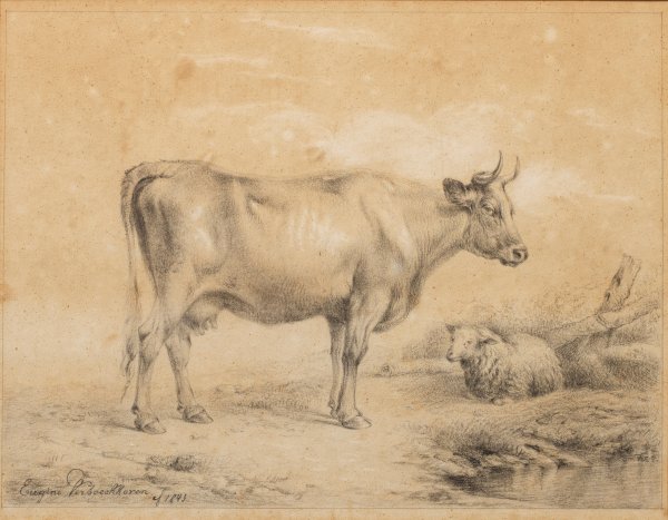 Lebendige Tierzeichnung Verboeckhovens, der zu den bedeutendsten Tier- und Landschaftsmalern der belgischen Schule des 19. Jhs. zählte und ländliche Tiere meisterhaft in Stimmungslandschaften oder in Ställe komponierte. Als renommierter Künstler schuf er auch Tierstaffagen für viele Gemälde seiner Malerkollegen und wurde Mitglied der belgischen Akademie. Bleistift/Papier. L. u. sign. u. dat. 1843. Gebräunt, fleckig. 29,7 cm x 38 cm (Passepartoutausschnitt). Rahmen.