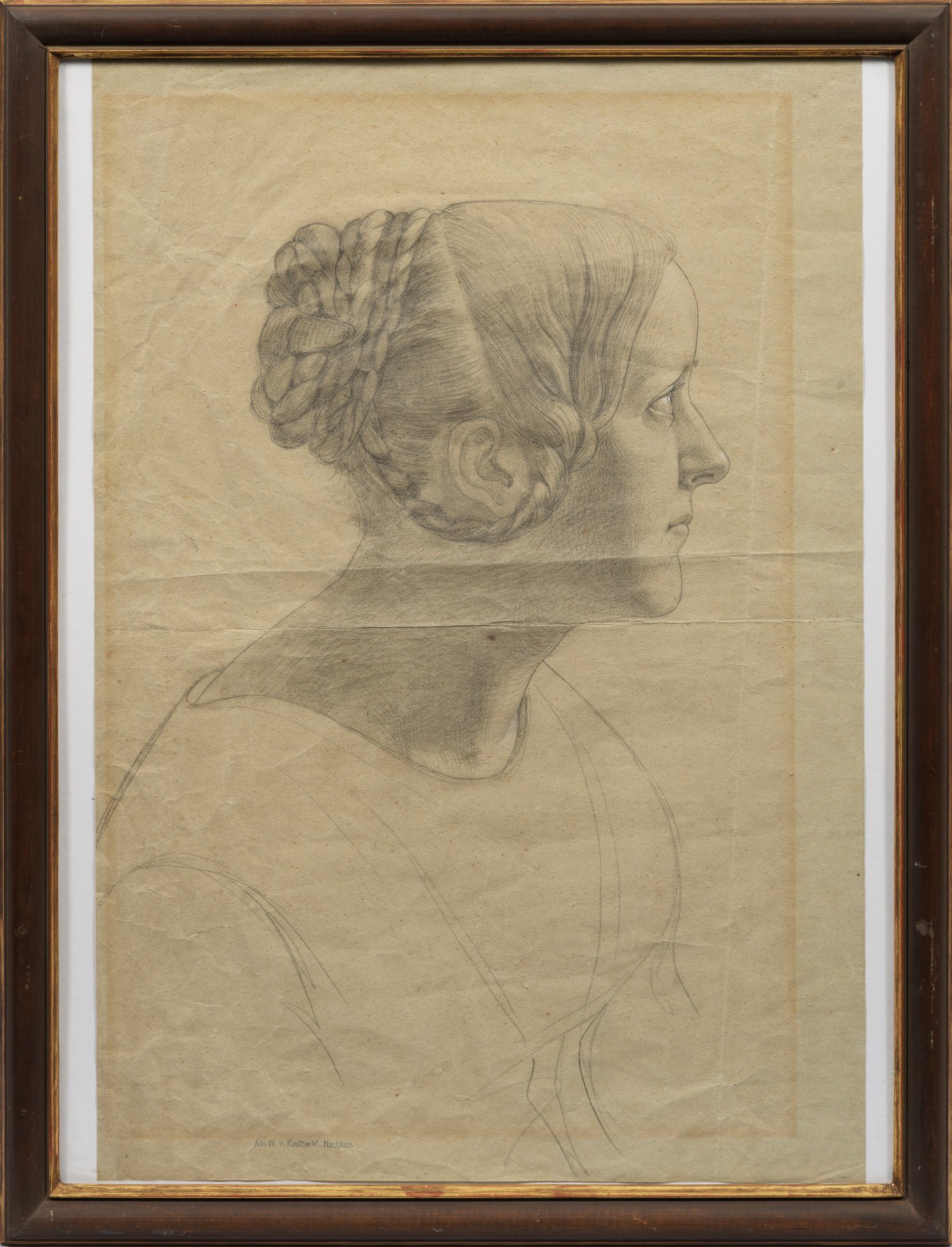 Akribisch und detailliert skizzierte Kopf- und Halspartie einer jungen Frau mit Flechtfrisur im Profil, mit lediglich flüchtigen Strichen umrissener Schulter- und Brustbereich. Reizvolles Studienblatt des bedeutenden Malers des 19. Jh., der bei Peter von Cornelius an der Düsseldorfer Akademie lernte und 1826 nach München ging. Bleistift/Papier. L. u. blauer Nachlassstempel (Lugt 1564). Ca. 58,5 cm x 40,4 cm. Rahmen.