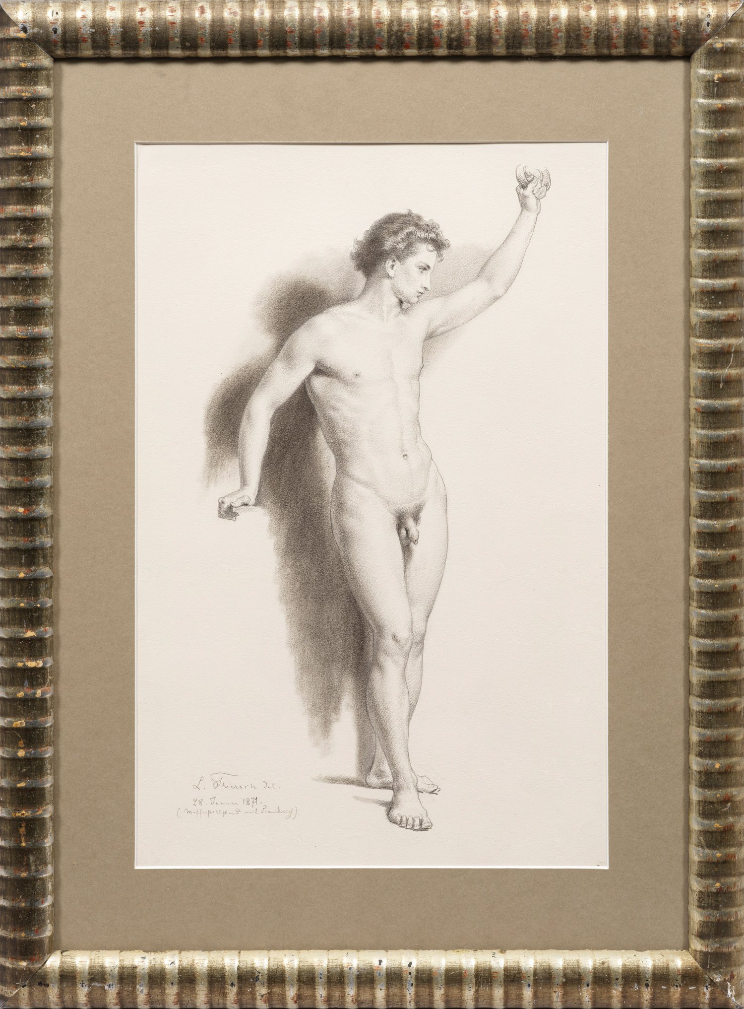 Äußerst detaillierte, in subtiler plastischer Körpermodellierung ausgeführte Studie Thierschs, der zunächst die Bildhauerklasse von Ludwig Schwanthaler an der Münchener Akademie besuchte, bevor er sich der Malerei zuwandte und Schüler von Heinrich Maria von Hess, Julius Schnorr von Carolsfeld und Karl Schorn wurde. Bleistift/Velin. L. u. sign., dat. "28. Januar 1871" und bez.; 45,8 cm x 30 cm. Rahmen.