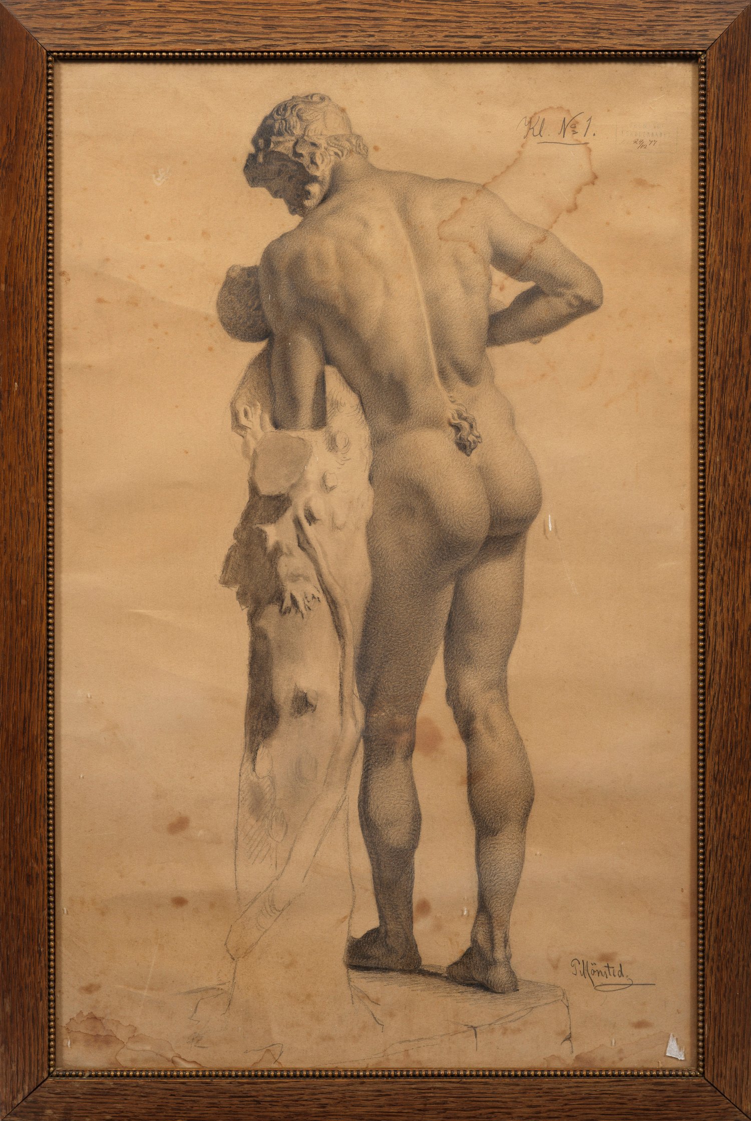 Academic study in pencil on paper. Signed. Inscribed and with academic stamp. Probably dated (18)77.