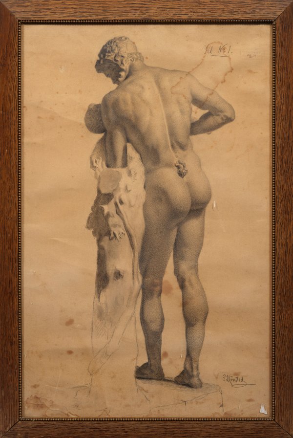 Detailgetreue Studie des mythologischen Mischwesens nach antikem Vorbild. Das vorliegende Blatt stellt eine Akademiestudie Mønsteds dar, der zwischen 1875 und 1878 Schüler der Kopenhagener Kunstakademie bei Julius Exner war. Nach dem Studium widmete er sich überwiegend der Landschaftsmalerei, wobei er wesentliche Anregungen in den Arbeiten Andreas Fritzs (1828 - 1906) fand. Besondere Bekanntheit erlangte er durch seine äußerst fein gemalten Fluss- und Schneelandschaften, die er seit 1874 auf Charlottenborg ausstellte. Bleistift und Kohle/Papier. R. u. sign.; Oben bez. "Kl. No. 1." und mit Akademiestempel, darauf handschriftlich bez. und wohl dat. (18)77. Blatt ca. 63,5 cm x 41,5 cm. Rahmen.