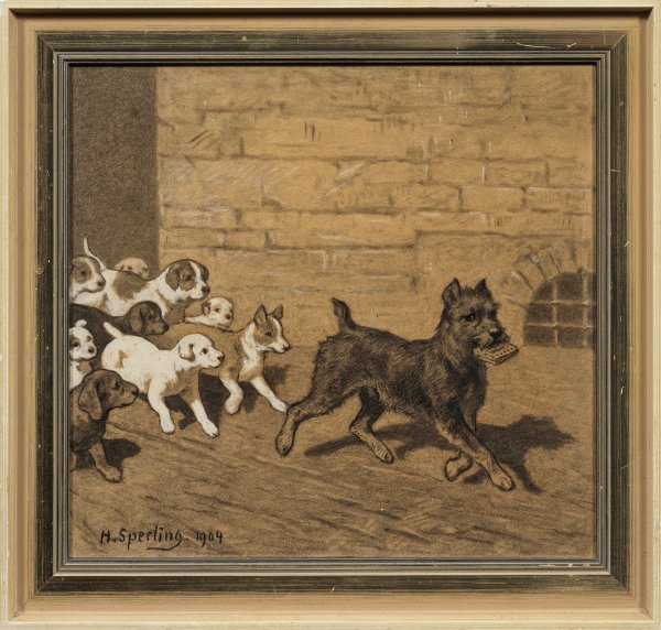 Charakteristisches Werk des bekannten Tiermalers, der sich nach seinem Studium an der Dresdener und Berliner Akademie bei Carl Steffeck und Paul Friedrich Meyerheim auf lebendig geschilderte Pferde- und Hundedarstellungen spezialisierte. Mischtechnik mit Deckweiß/Papier, kaschiert auf Karton. L. u. sign. u. dat. 1904. Rücks. Plakette mit Titel und Widmung. Ca. 28 cm x 29,5 cm. Rahmen.