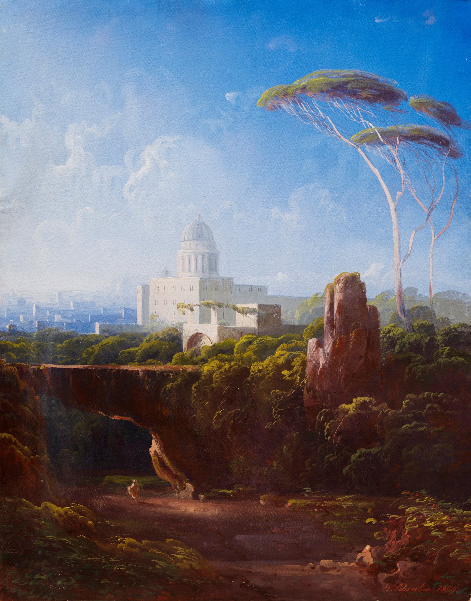 In leuchtendem Kolorit und effektvoller Licht- und Schattenführung geschilderte, sommerliche Impression, in der Schreiber das helle, südliche Licht vortrefflich einfängt. Der fränkische Künstler war Schüler von Carl Blechen und August Ferdinand Wilhelm Schirmer und bildete sich um 1840 in Rom weiter. Gouache/Papier, kaschiert auf Karton. R. u. sign. und dat. 1869. 60,2 cm x 47,4 cm.