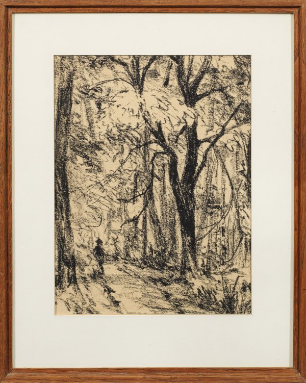 Mit flüchtigem, ausdrucksstarkem Duktus eingefangene Waldszene aus dem Umkreis August Mackes. Kohle/Papier. 32,6 cm x 25,4 cm. Rahmen.