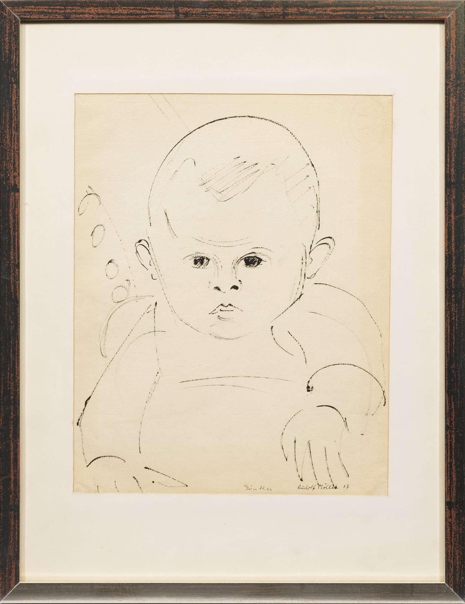 Flüchtig umrissene Studie, die den Sohn des Künstlers darstellt. Möller, der Schüler bei Lovis Corinth war, wird zu den Künstlern der sog. Verschollenen Generation gezählt und war Mitglied der Novembergruppe. Tusche/Papier (Wasserzeichen). R. u. sign. u. dat. (19)17. Mittig bez. "Günther". 29,5 cm x 23,3 cm (Passepartoutausschnitt). Rahmen.