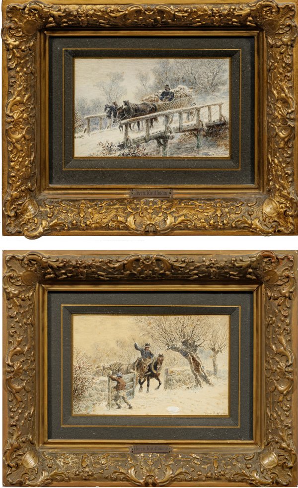 Gegenstücke. Die Darstellungen gehören zu den für Kauffmann charakteristischen, subtil beobachteten, ländlichen Szenen, in denen er Pferdefuhrwerke und Kutschen schilderte, oft im Schneetreiben oder bei Regen. Feder u. Aquarell mit Weißhöhungen/Papier. Jeweils r. u. sign.; Ger. stockfleckig. Ca. 12,5 cm x 19,5 cm (Zeichnung). Rahmen.