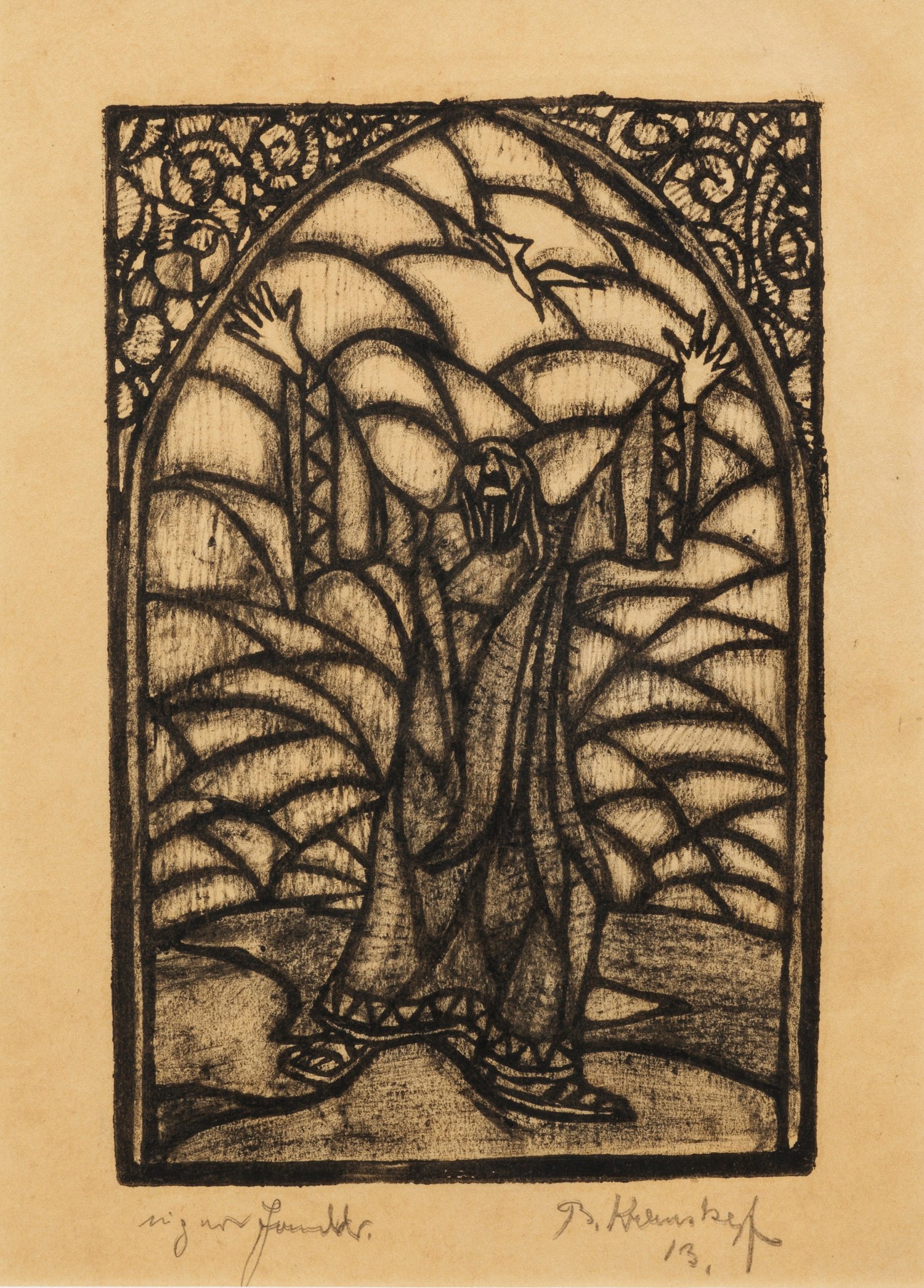 Vor ornamental durchwirktem Hintergrund, der unter einem Spitzbogen stehende Dargestellte seinen Blick und seine Arme gen Himmel hebend, in den soeben eine Taube aufsteigt. Möglicherweise als Entwurf für ein Kirchenfenster konzipierte Komposition des bedeutenden Berliner Expressionisten, der 1918 zu den Mitbegründern der "Novembergruppe" gehörte. Tusche und Feder/Papier. R. u. sign. und dat. (19)13 sowie bez.; Darstellung 22 cm x 14,5 cm. Blatt 33,6 cm x 24,9 cm. Rahmen.