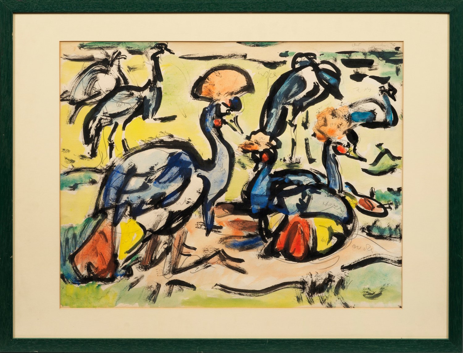 Dynamisch-expressiv komponierte Darstellung zahlreicher Kraniche auf einer Wiese. In Stil und Sujet charakteristisches Blatt Winklers, der zu der zweiten Generation der Expressionisten in Deutschland zählt. Aquarell über Bleistift/Papier. 49,4 cm x 62,5 cm. Rahmen.