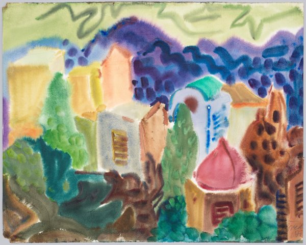 Expressionistisches Werk aus dem reifen Oeuvre Bredows, der wie viele wiederentdeckte Künstler der Klassischen Moderne zur sog. Verschollenen Generation gezählt wird. Bredow studierte in Berlin bei Max Kaus und gehörte zum Freundes- und Bekanntenkreis der "Brücke"-Maler Erich Heckel und Karl Schmidt-Rottluff, deren Einfluss sich ebenso wie der von Emil Nolde in diesem expressionistischen Blatt widerspiegelt. Aquarell über Bleistuft/Papier. R. u. sign. und dat. (19)71. Verso Nachlass- und Sammlungsstempel sowie (Werk-)Nr. A 426. Ca. 48,4 cm x 59,5 cm.