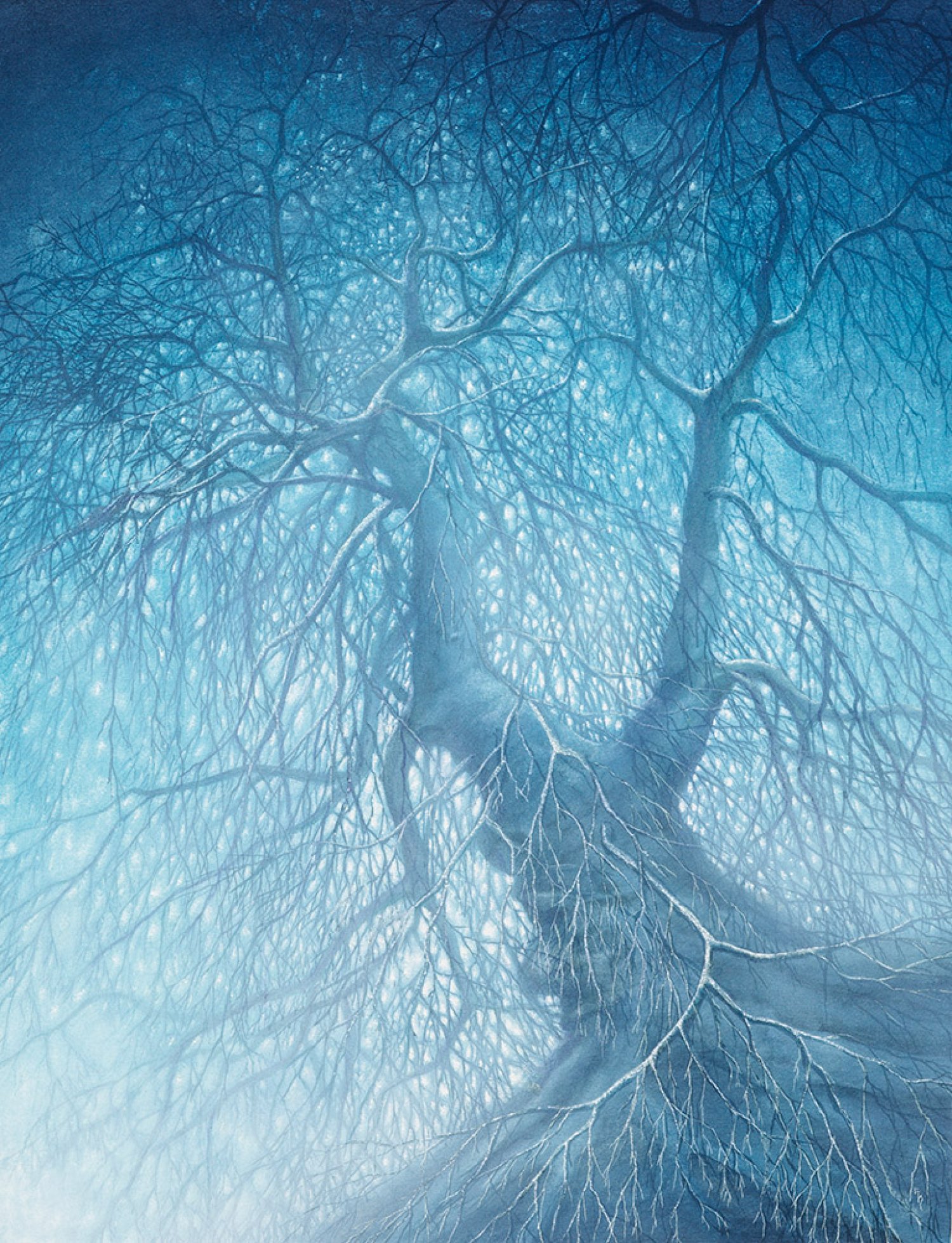In Perspektive und Kolorit bedrohlich inszenierte Darstellung eines knorrigen, stark verästelten Baumes in effektvoller Lichtbehandlung. Friedrich Hechelmann studierte 1969-1972 an der Wiener Akademie als Meisterschüler von Rudolf Hausner. Dessen Einfluss und Inspiration als bedeutender Vertreter der Wiener Schule des phantastischen Realismus ist in Hechelmanns Oeuvre eminent. Mischtechnik/Schoellershammer-Karton. R. u. monogr.; 41 cm x 31 cm. Rahmen.