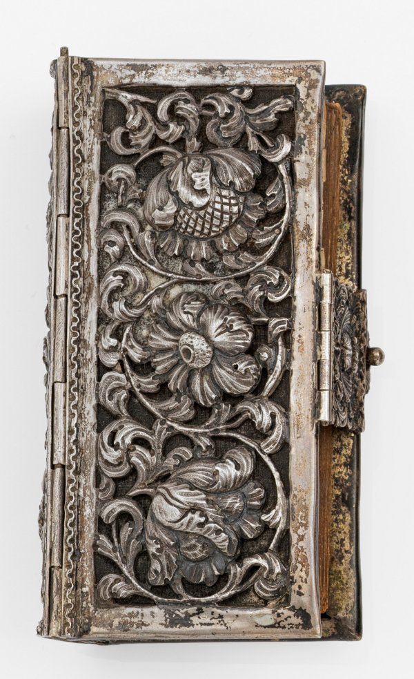Hochrechteckiges Buch. Prächtiger, scharnierter Silbereinband, bestehend aus reliefplastischen Barockblüten und Ranken. Scharnierte Schließe. Frontispiz handschriftlich bez. und dat. "Andachtsbüchlein 1818". H. 4,5 cm. 12 cm x 7 cm.