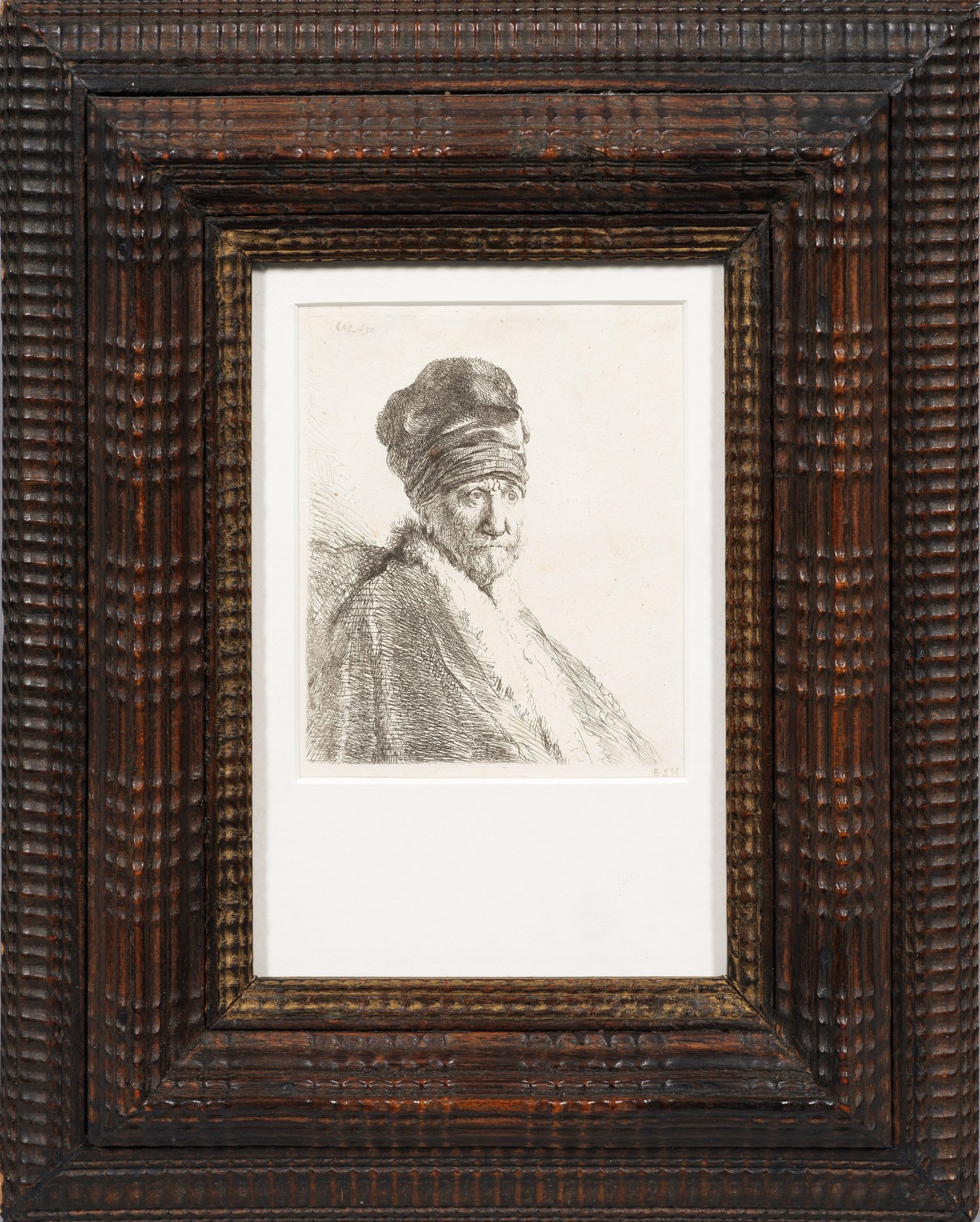 Skeptisch, mit in Falten gelegter Stirn blickt der ältere Mann mit turbanähnlicher Haube und Pelzkragen in die Ferne. Rembrandt schuf zahlreiche solcher Charakterköpfe, sog. "Tronjes", die im flämischen und holländischen Barock äußerst beliebt waren. Im frühen Oeuvre Rembrandts findet man zahlreiche Bildnisstudien seiner Mutter, ob er in dem vorliegenden Blatt jedoch seinen Vater dargestellt hat, bleibt ungeklärt.