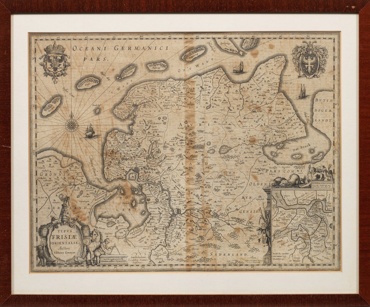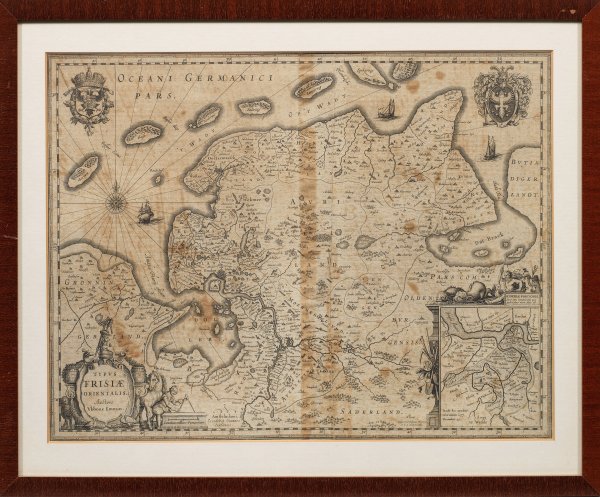Kupferstich/Bütten. Detailreiche, geographisch exakte Karte mit Wappenkartuschen, dekorativer, figürlicher Titelkartusche und Inset-Karte der Dollart-Region von der Flut im Jahr 1277. Gestochen von Salomon Rogiers und Evert Simonz Hamersvelt nach Ubbo Emmius, erschienen bei Johannes Janssonius, Amsterdam, 1630-um 1650. Gebräunt und leicht stockfleckig. 38 cm x 49,5 cm (Passepartoutauschnitt). Rahmen.