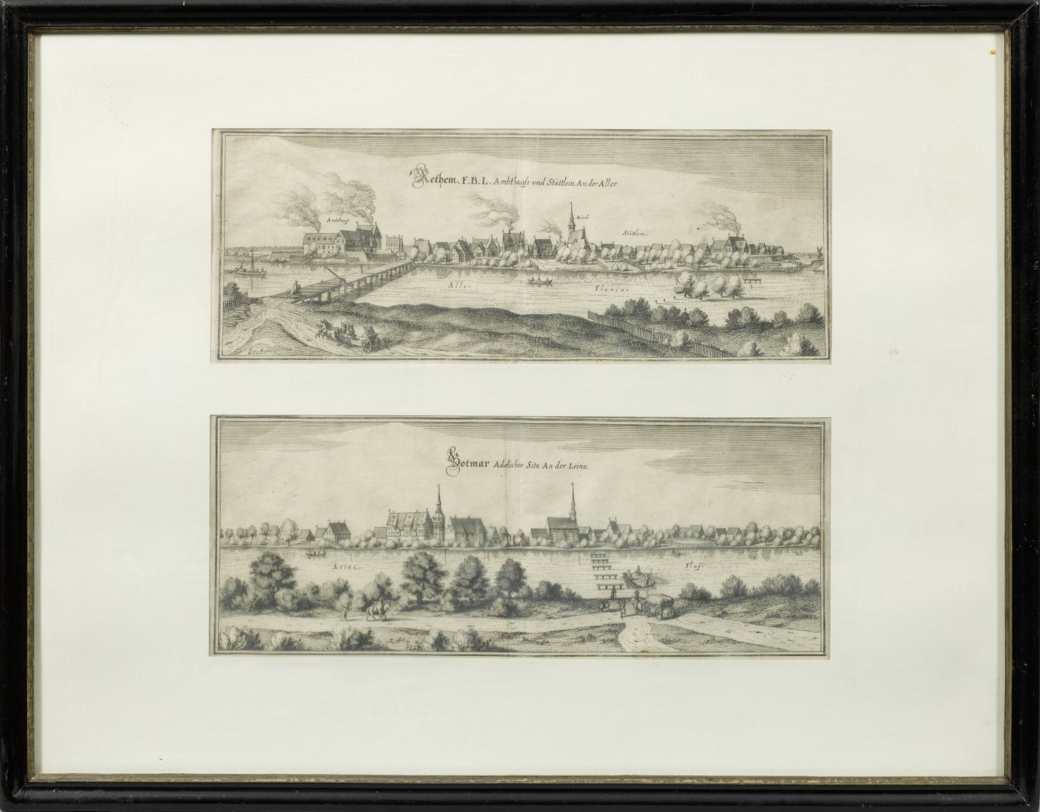 Drei Kupferstiche aus: Matthäus Merian, "Topographia und Eigentliche Beschreibung Der Vornembsten Stäte (...) in denen Hertzogthümer(n) Braunschweig und Lüneburg (...)", erstmals erschienen in Frankfurt/Main 1654. Darstellungen ca. 12,5-13 cm x 34,9-35,2 cm. Rahmen.