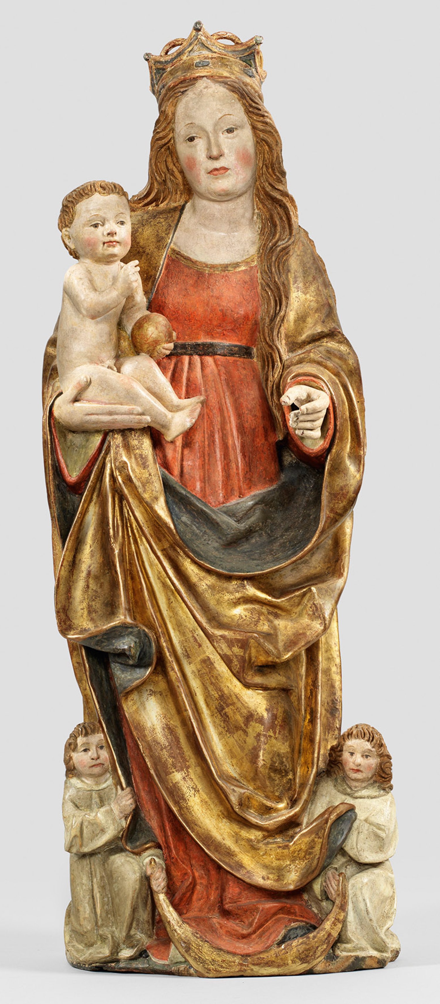 Hochrechteckiger, gefasster, bemalter und vergoldeter, hölzerner Schrein mit Schnitzwerk und zwei in Tafelmalerei ausgeführten Flügeln aus dem Umkreis von Hans Schäufelein (um 1480/85 - 1538/40), ausgeführt wohl für einen hohen Kleriker. Auf den Flügelaußenseiten szenische Darstellung der Verkündigung Mariens durch den Erzengel Gabriel in einem Interieur unter filigranem Akanthuswerk. Auf der linken Seite die Jungfrau Maria mit langem, offenem Haar und Scheibennimbus, an einem altarartigen Möbel in einem aufgeschlagenen Buch lesend; über ihr eine Taube als Symbol für den Heiligen Geist, unter ihr ein Topf mit Maiglöckchen als Symbol für die jungfräuliche Empfängnis, Demut und Bescheidenheit Mariens. Ihr gegenüber auf der rechten Bildseite stehend Gabriel mit langem Heroldsstab in seiner linken Hand. Den Figuren zugeordnet Schriftbänder mit lateinischen Textzeilen "Ecce ancilla domini" ("Siehe, die Magd des Herrn") und "Ave gratia plena dominus (tecum)" ("Sei gegrüßt, du voll der Gnade! Der Herr ist mit dir!") nach dem Lukas Evangelium, die zugleich Teil der häufigen Gebete "Angelus Domini", "Ave Maria" und "Rosenkranz" sind. Auf den Flügel-Innenseiten die jungfräulichen Heiligen Dorothea und Genoveva von Paris vor Wandteppichen unter Halbrundbögen mit Akanthusranken stehend: Dorothea mit Blumenkranz und -korb, zu ihren Füßen das Jesuskind mit Rosenstängel; Genoveva mit brennender Kerze als Attribut. Am Unterrand der Flügel die Datierung "1508". Der Mittelschrein mit korrespondierend gestalteter, gemalter Tapisserie, die obere, goldene Fläche der Rückwand mit punziertem Muster; vorderseitig bekrönt durch ein geschnitztes, gotisches Maßwerk mit Akanthusranken. Im Schrein eingestellt eine spätgotische Mondsichelmadonna aus geschnitztem, gefasstem und partiell vergoldetem Holz, rücks. gehöhlt; Maria in bodenlangem Gewand stehend, das Christuskind auf ihrer rechten Hand sitzend, zu ihren Füßen flankiert von zwei Engeln, welche die Mondsichel festhalten; Fassung übergangen u. rest., linke Hand Mariens erg.; Beigefügt zwei Messing-Scheibenleuchter. Schrein-H. ca. 119 cm, B. vorne ca. 98 cm, hinten ca. 91 cm; Flügel jeweils ca. 115 cm x 44,5 cm; Ges.-B. (ausgeklappt) ca. 180 cm.