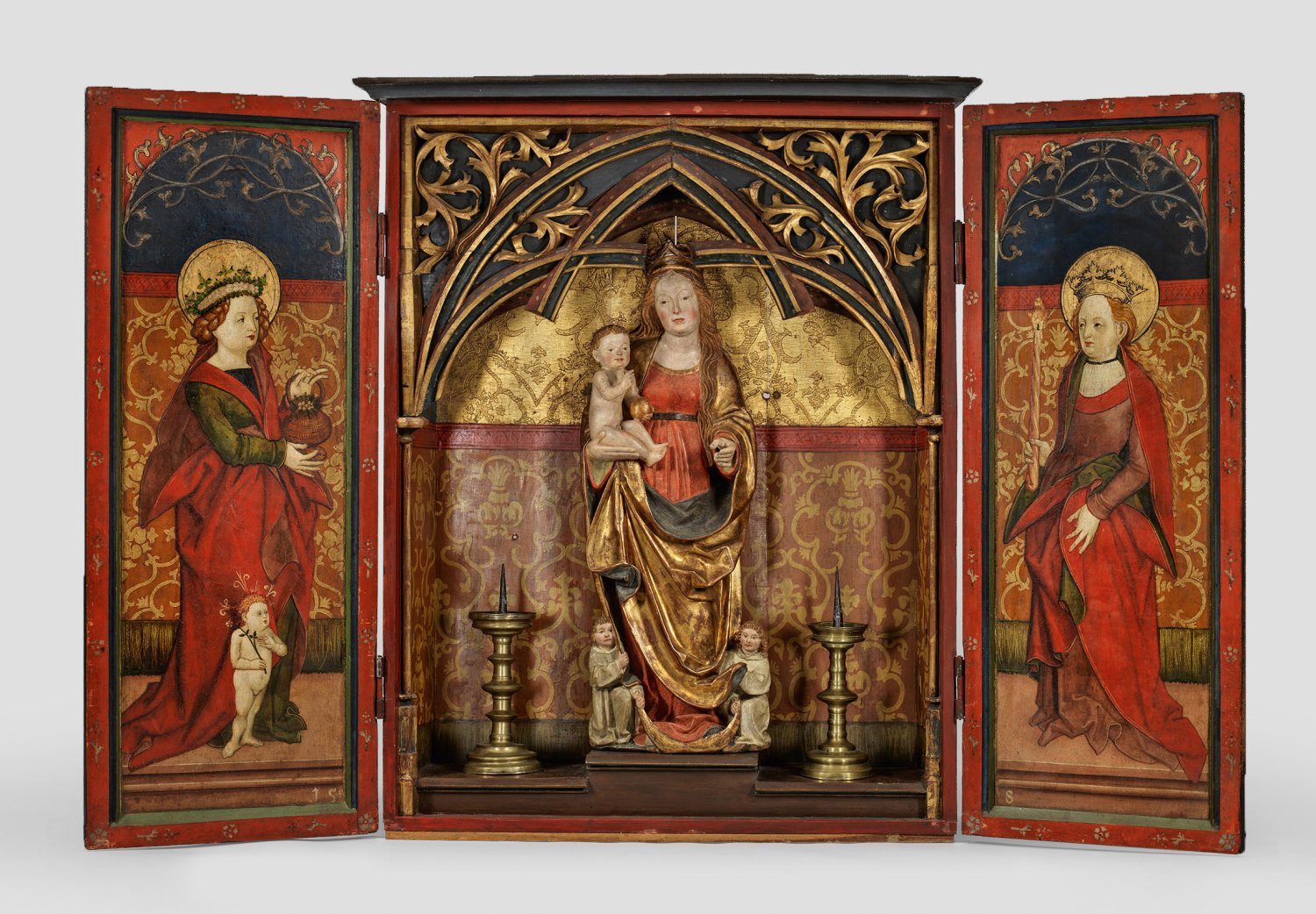 A painted double-winged South German probably Franconian home altarpiece depicting the Annunciation and the Saints Dorothea of Caesarea and Genevieve. In the central shrine a German carved, painted and gilt wooden sculpture of the Woman of the Apocalypse with two angels. Accompanied by two South German brass candlesticks. Polychromy of the sculpture overpainted and restored, left hand of Mary replaced.