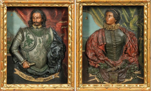 Gegenstücke. Polychrom gefasste Wachsbossierungen im Hochrelief auf Schiefertafeln mit gemaltem Landschaftshintergrund, kombiniert mit kleinen Perlen und anderen Materialien. Halbfigurige, fein und detailreich ausgeführte Reliefbildnisse eines vornehmen, adeligen Paares. Der Mann als Feldherr in reich verziertem Harnisch und umgelegtem Mantel, unterhalb ein Schriftband "B. M. P. Gio Tomaso Blank 1594". Seine Gemahlin als Gegenstück in einem dunklen, geschnürten Kleid mit weißer Halskrause und rotem, gemustertem Mantel, unterhalb ein Vogel mit Wappen vor einer Tuchdraperie und Zweigen. Ca. 26,5 cm x 21 cm. Montiert in vergoldete, geschnitzte Barock-Kastenrahmen unter Glas.