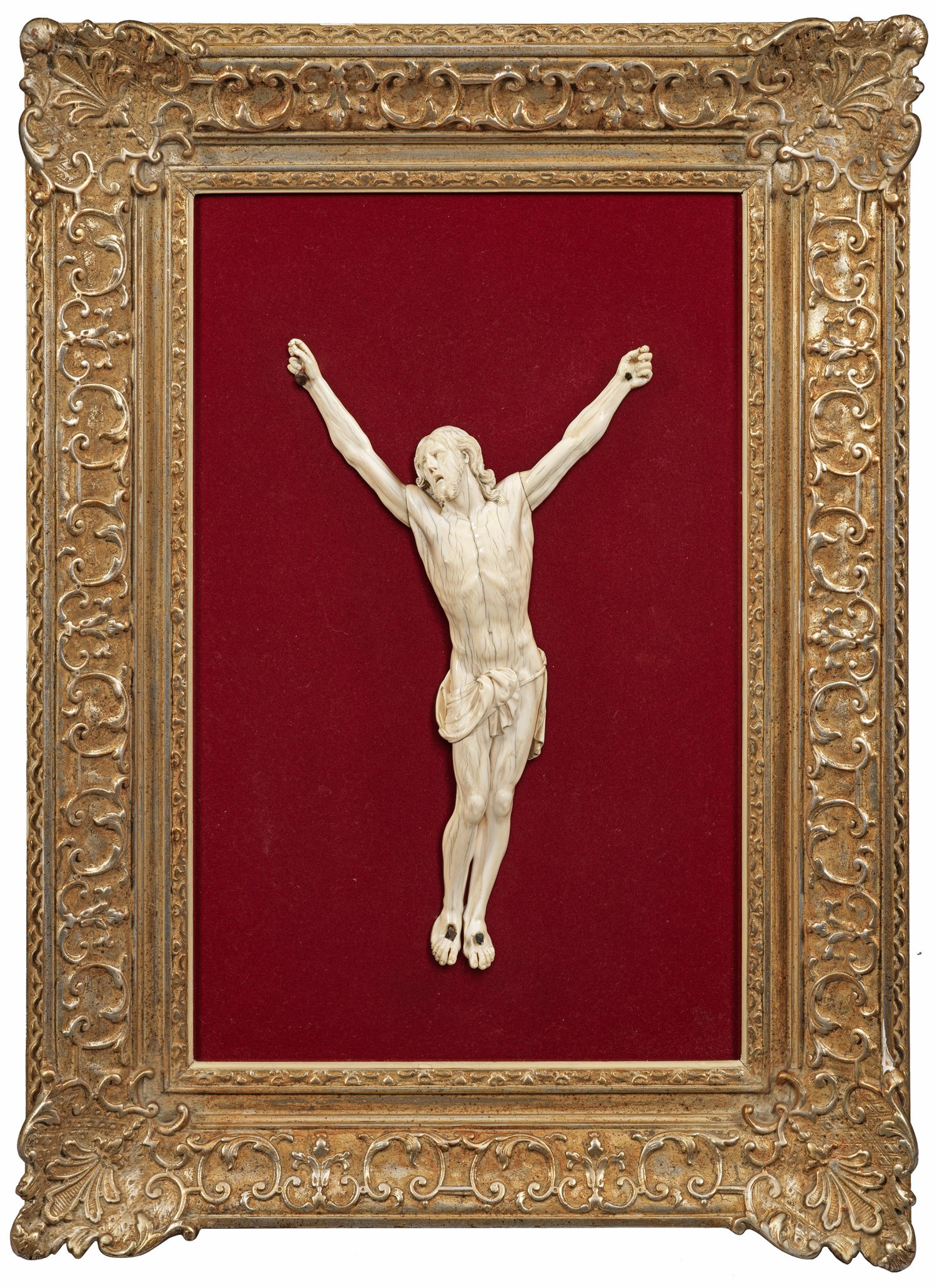Flemish sculptor active circa 1630-1650. Carved ivory Corpus Christi. Mounted on modern dark red felt background in a gilt wood and plaster frame. CITES included. Accompanied by an expertise from Thomas Dennerlein, Bayreuth, 29th of February 2024.
