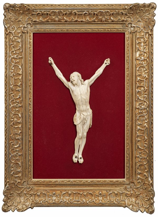 Elfenbein, geschnitzt. Im 20. Jh. montiert vor dunkelrotem Filzhintergrund in vergoldetem Stuckrahmen. Meisterhaft fein und detailreich, in sorgfältiger, subtiler Schnitzarbeit ausgeführter, sog. Jansenistischer Corpus Christi im Viernagel-Typus mit v-förmig diagonal hochgestreckten Armen sowie mehrschichtig gelegtem, faltenreichem Lendentuch. Die Christus-Darstellung zeichnet sich durch die Anwendung genauer anatomischer Studien in der muskulösen Körperlichkeit bei gleichzeitiger weitgehender Vermeidung von den physischen Leiden wiedergebenden Details aus. Bewusst nicht vorhanden sind die Dornenkrone und Lanzenwunde, aber auch aus den Nagelwunden heraustretende Bluttropfen. Lediglich das zur rechten Seite geneigte Haupt mit geöffnetem Mund, sichtbaren Zähnen und lebendig offenen Augen deutet das Leiden und die Zwiesprache zwischen Gottvater und Sohn an. Hierdurch hat der Bildhauer künstlerisch geschickt die traditionelle Ikonographie des Christo morto mit der eines Christo vivo verbunden. Im 17. Jh. haben Mattheus van Beveren (um 1635/36 - 1696) und andere flämische Bildhauer diese Darstellungsidee weiter verfeinert. H. ca. 40 cm.