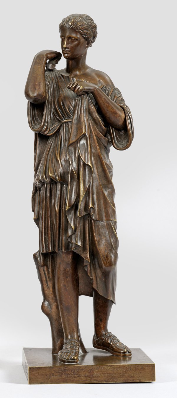 Bronze, braun patiniert. Auf der Plinthe gravierte Widmung von 1886. Sehr fein ausgeführte Statuette nach der berühmten griechischen Marmorskulptur des 4. Jhs. v. Chr., die Praxiteles oder dessen Werkstatt zugeschrieben wird. 1796 von Gavin Hamilton auf dem Besitz des Prinzen Borghese in Gabii bei Rom gefunden, wurde sie 1807 von Napoleon erworben und seit 1820 im Louvre in Paris gezeigt. H. 42,8 cm.
