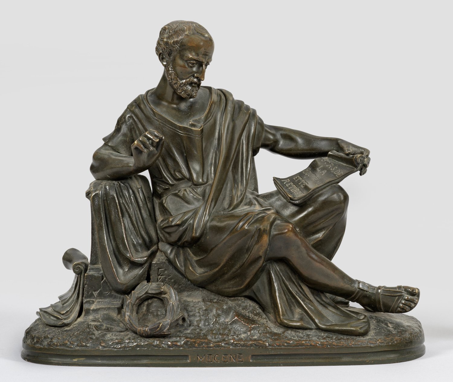 Bronze, dunkel patiniert. An der Plinthe betitelt. Vollplastische, detailreiche Darstellung des Gaius Maecenas als Dichter mit Schriftrollen und Lorbeerkranz. Dieser ist heute vor allem als Vertrauter und politischer Berater des römischen Kaisers Augustus sowie Förderer der Künste bekannt, wodurch sein Name als "Mäzen" zu einem Begriff wurde. H. 24,2 cm.