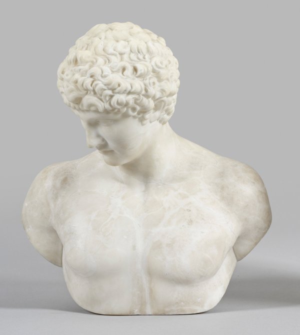 Alabaster. Fein und subtil ausgeführte, sorgfältig polierte, vollplastische Darstellung, den Kopf mit detailreich gelocktem Haar leicht nach rechts unten gesenkt. Darstellung nach den bekannten antiken römischen Skulpturen des Hermes (sog. ("Belvedere Antinous") in den Vatikanischen Museen (Museo Pio-Clementino) oder des sog. "Kaptilolinischen Antinous" (auch "Antinous Albani" genannt). H. 34 cm.