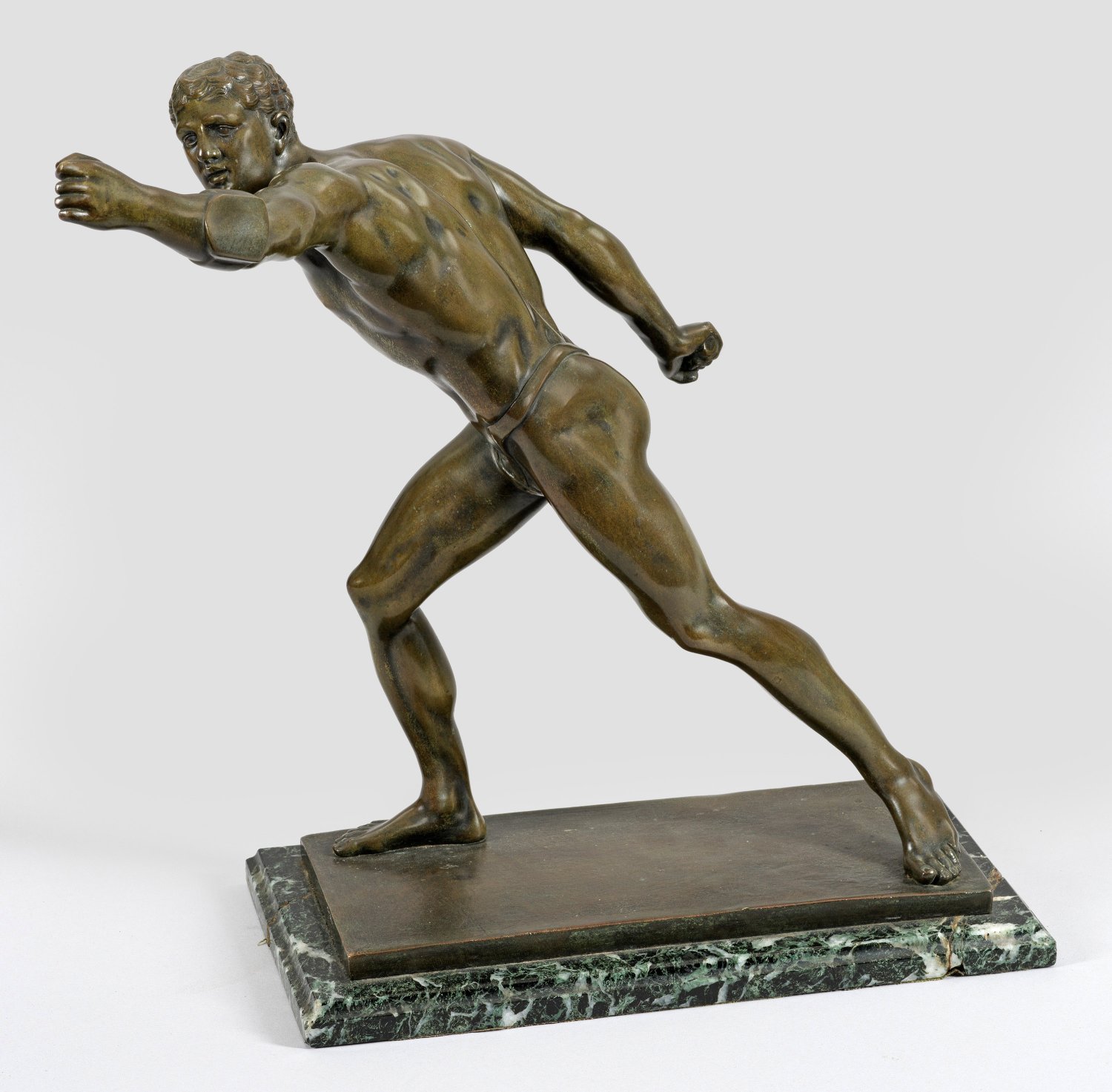 Bronze, dunkelbraun patiniert; dunkelgrüner bis schwarzer, hell geäderter Marmorsockel. Stark verkleinerte Bronzeplastik nach der lebensgroßen, hellenistischen Marmorskulptur des 1. Jhs. v. Chr.; Diese wurde Anfang des 17. Jhs. bei Ausgrabungen entdeckt und 1613 Teil der Borghese-Sammlung in der Villa Borghese in Rom. 1807 erwarb Napoleon die Skulptur, die später in den Louvre kam. Seit dem 17. Jh. wurde sie zu einer der am meisten bewunderten und kopierten Skulpturen der Antike. Sockel rep.; Ges.-H. 47,5 cm.