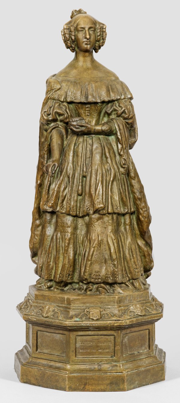 Bronze, goldbraun patiniert. Sign.; Am Sockel in Versalien betitelt "Louise Marie (/) Reine des Belges". Vollplastische Darstellung der ersten belgischen Königin (1812 - 1850) in vollem Ornat mit Hermelinmantel und kleiner Krone auf dem Haupt; auf dem achteckigen Postamentsockel Wappenschilde mit dem Brabanter Löwen als Wappentier des 1830 begründeten Königreichs Belgien. Der aus einer bedeutenden Bildhauerfamilie stammende Auguste van den Kerckhove studierte an der Antwerpener Akademie, 1861-1864 besuchte er das Atelier von Louis Jéhotte und an der Brüsseler Akademie das von Eugène Simonis. Er arbeitete hauptsächlich in Brüssel. In den Königlichen Museen der Schönen Künste in Brüssel hat sich auch eine von ihm 1869 geschaffene Marmorbüste des verstorbenen Kronprinzen Leopold von Belgien (1859 - 1869) erhalten. H. 72,5 cm.