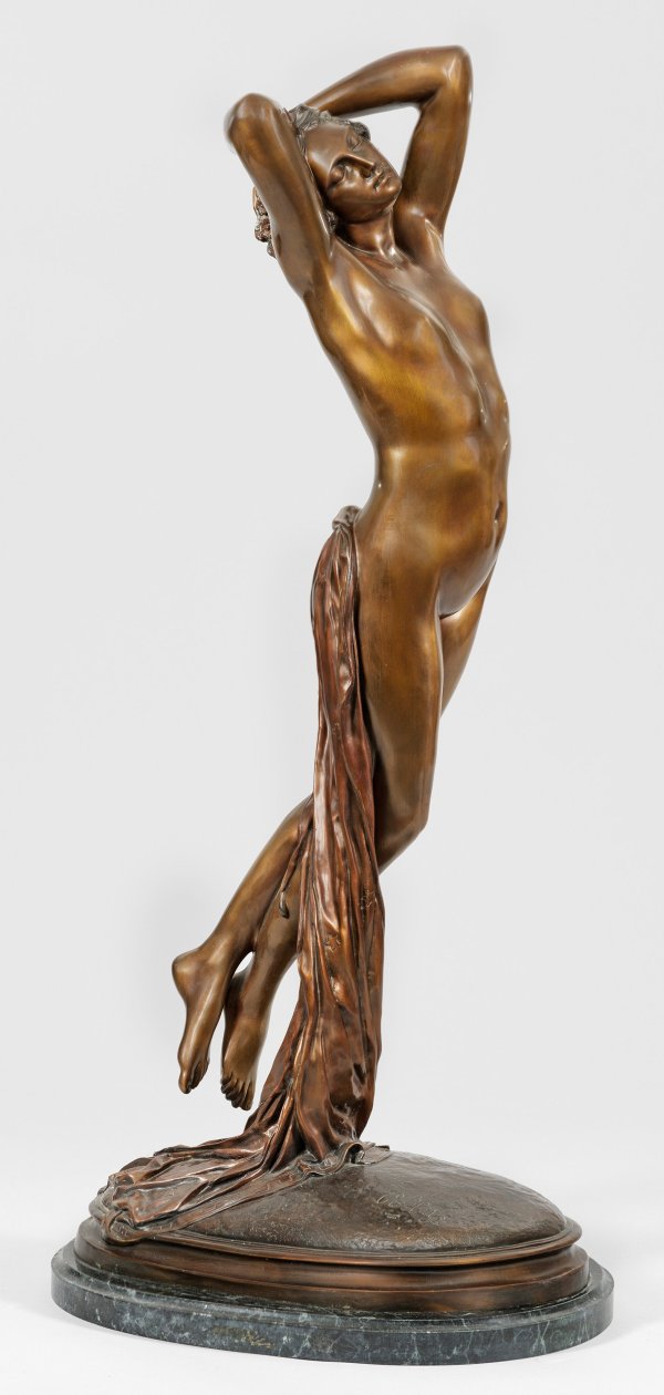 Bronze, braun patiniert. Künstler-Bez.; Gießerstempel. Dunkler Marmorsockel. Guss 21. Jh.; Vollplastische Aktdarstellung einer jungen Frau in schwebender Pose, die Arme zu dem durch einen Stern und Blumen geschmückten Haar erhebend. Mit "Une Heure De La Nuit" erlangte Pollet rasch große Anerkennung, als er das Gipsmodell 1848 im Pariser Salon ausstellte. Er selbst schuf mehrere Marmorversionen, die erste zeigte er 1850 im Salon (seit 1870 im Louvre, heute im Museum des Zweiten Kaiserreichs im Chateau de Compiègne). Auf der Weltausstellung 1855 in Paris wurde die Figur dann als Bronzeplastik präsentiert, die von der Gießerei Colin in verschiedenen Größen ausgeführt wurde. Ges.-H. 100 cm.