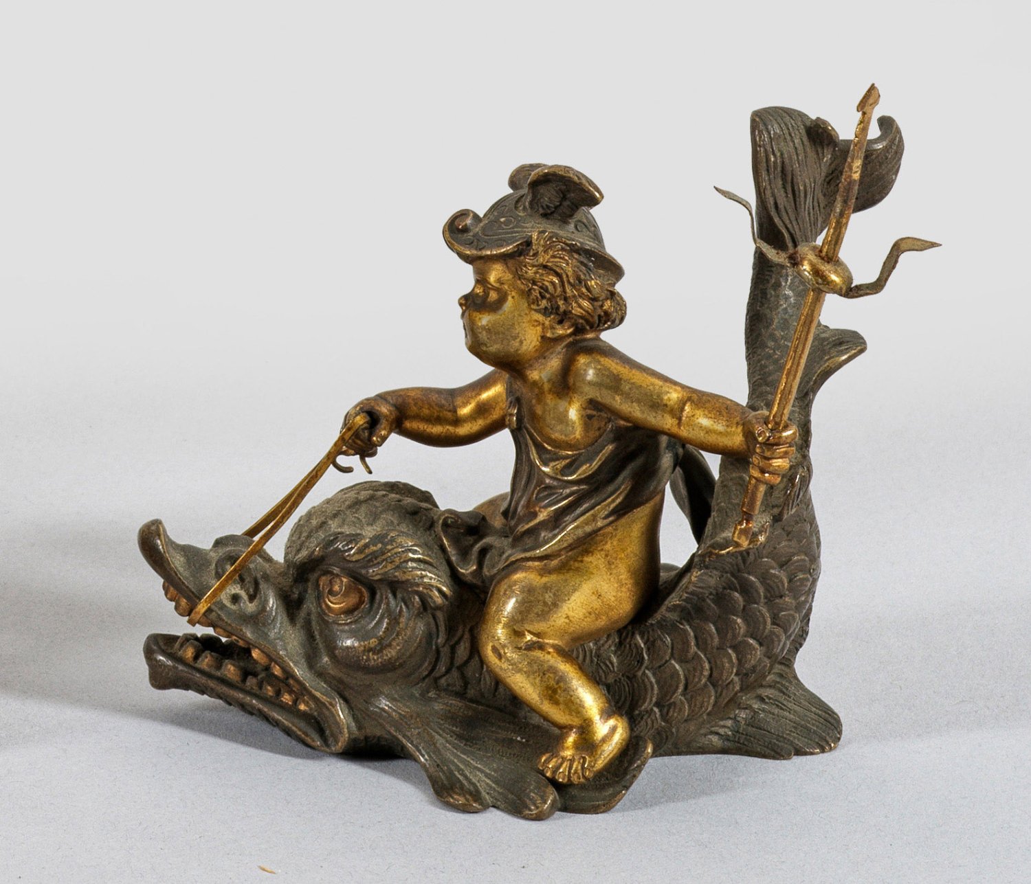Bronze, ziseliert, versilbert und vergoldet. Vollplastische Miniaturfigurengruppe in der Tradition von Adraen de Vries, der Putto mit geflügeltem Helm und Dreizack, den fantasievollen Delfin mit Zügeln reitend. H. 8,4 cm.