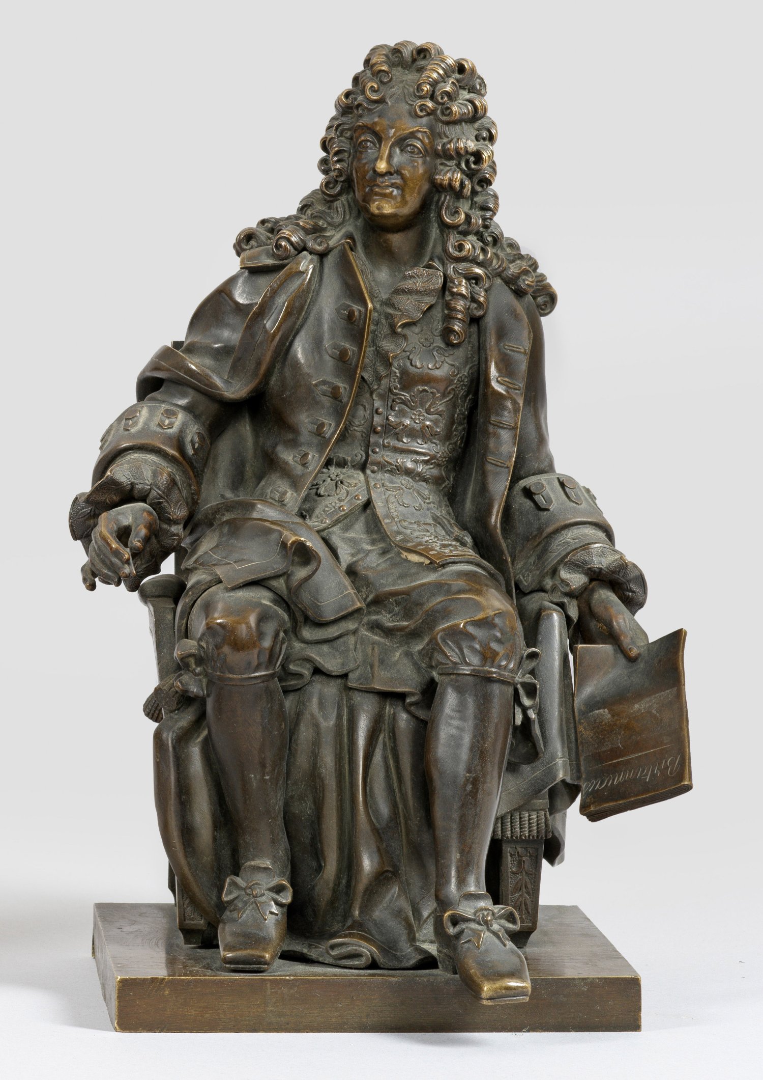 Bronze, dunkelbraun patiniert. Im Detail fein ausführte und ziselierte Darstellung des auf einem Lehnstuhl sitzenden Herrschers als Ganzfigur, wohl König Georg I. oder II., in seiner linken Hand ein Blatt mit der Inschrift "Britannicus" haltend. H. 28,2 cm.