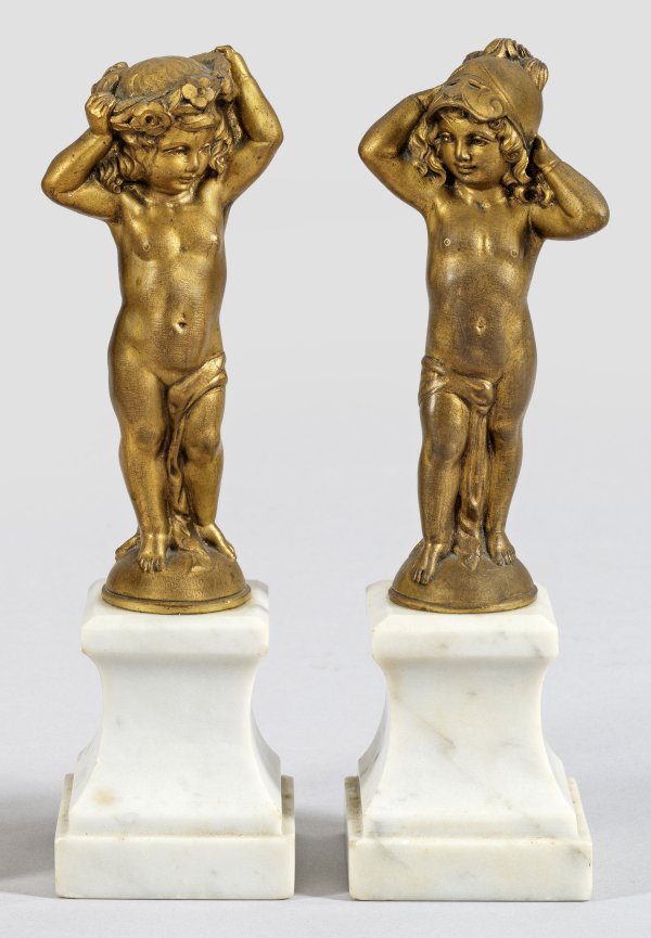 Paar Putto-Figuren eines Mädchens mit Blumenkranz und eines Knaben mit Helm