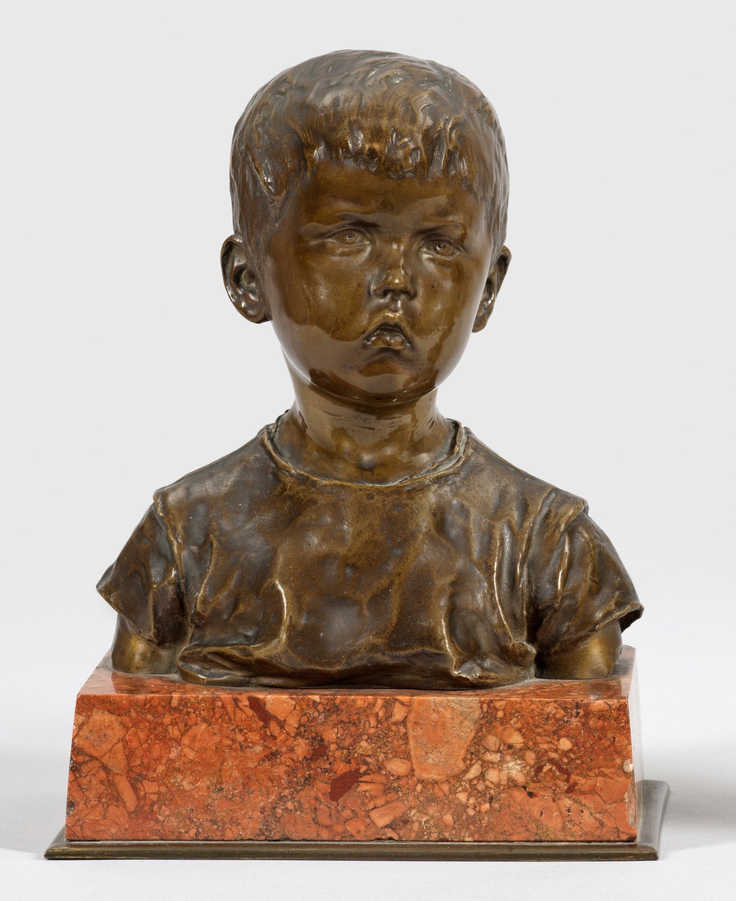 Bronze, dunkelbraun patiniert. Sign., betitelt u. dat. (18)95. Rote Marmorplinthe. Jugendstil-Büste eines jungen Knaben. Aichele studiert in Stuttgart und seit 1877 in Berlin, wo er dauerhaft ansässig wurde. 1892 beschickte Aichele die Akademie-Ausstellung, danach des Öfteren die Großen Berliner Kunstausstellungen. Sein Hauptwerk ist der ebenfalls schon im Jugendstil gestaltete Sintflutbrunnen in Berlin von 1895. Ges.-H. 22 cm.