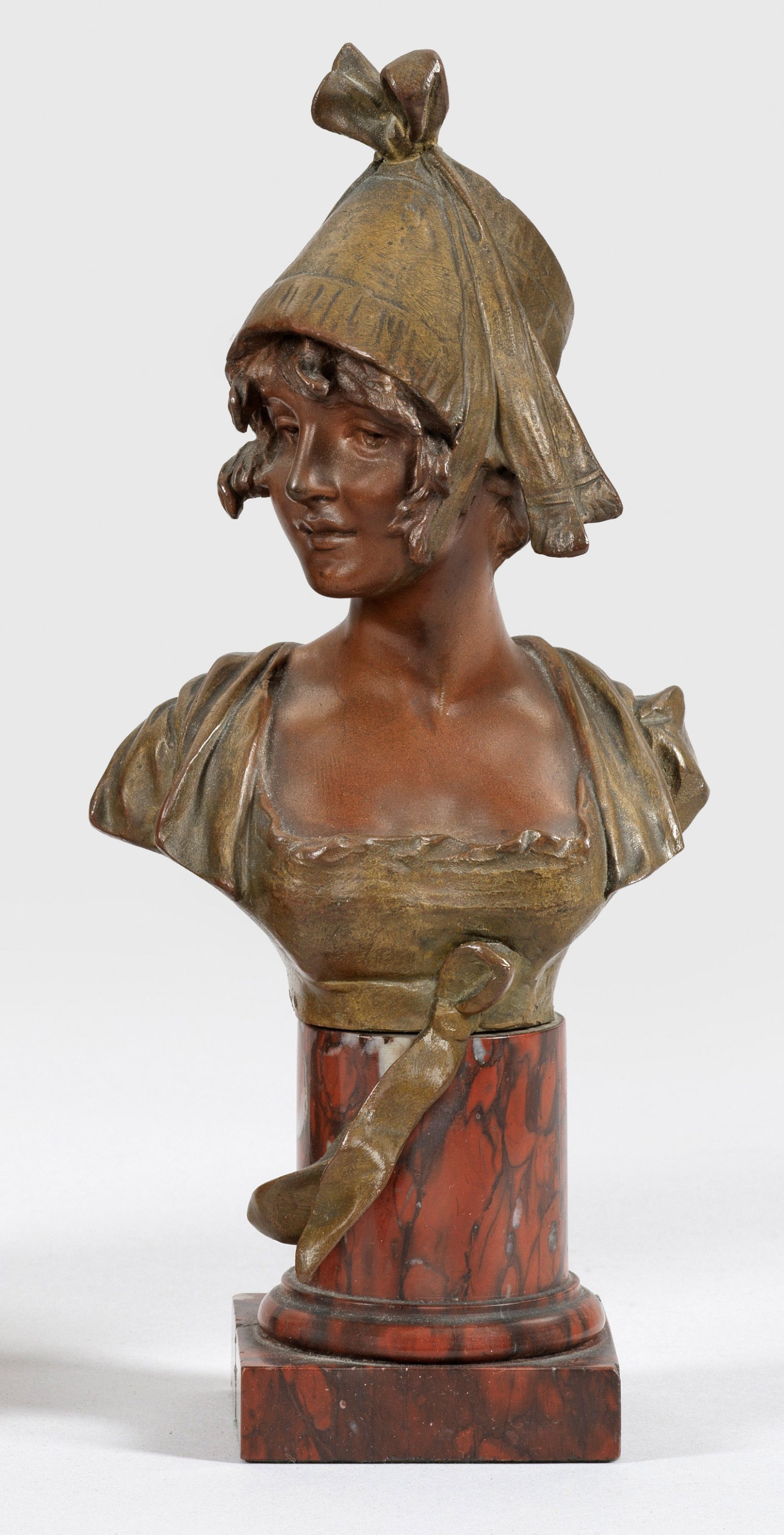 Bronze, in zwei Brauntönen patiniert. Sign. Gießerstempel mit Pariser Wappen u. Bez. "SOCIETÉ DE BRONZES DE PARIS. JOSEF KAYSER HAMBOURG. Säulenpostamentsockel, rep.; Ges.-H. 22 cm.
