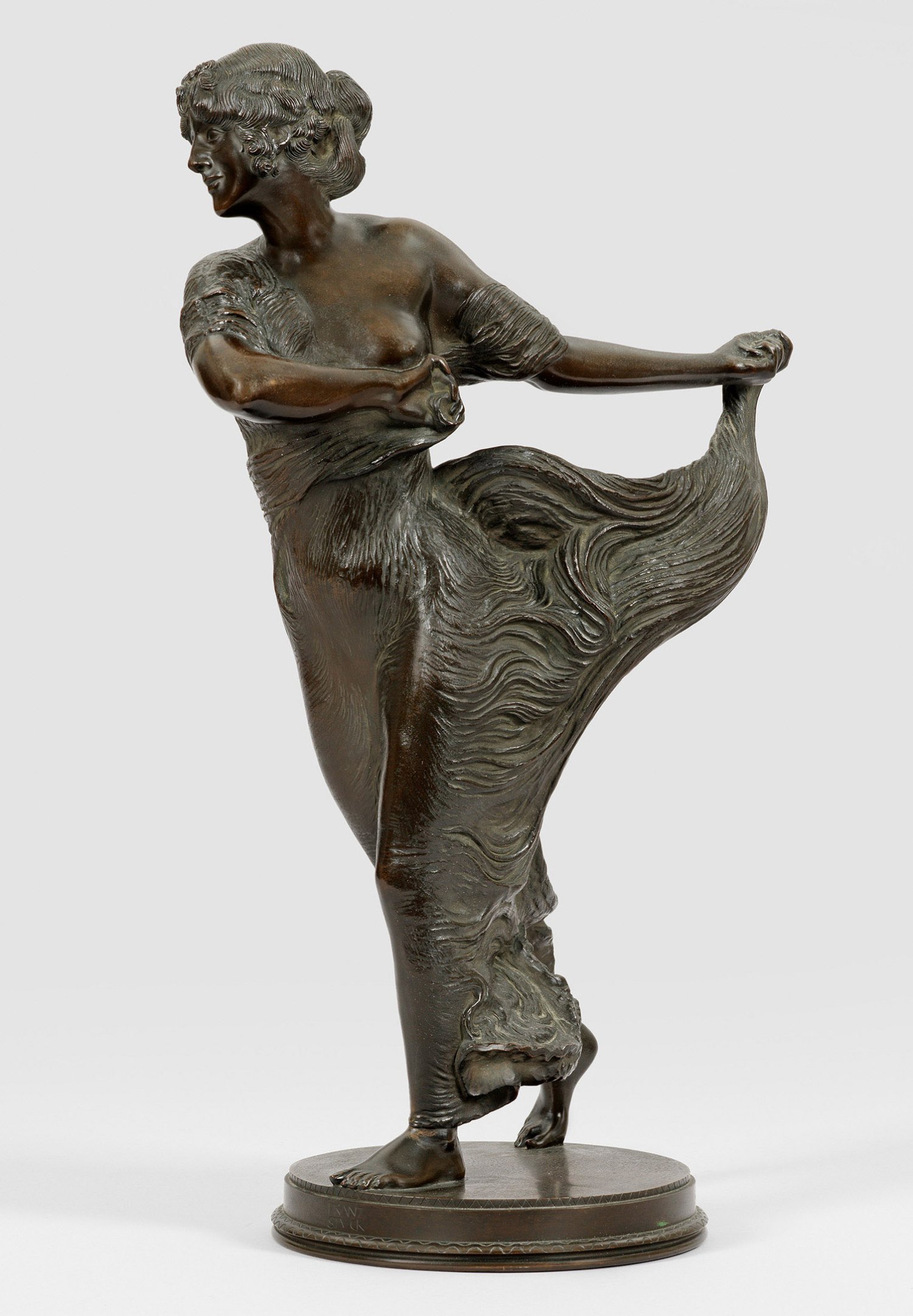 Bronze, dunkel patiniert, 1897/98. Sign. "FRANZ STUCK", Gießerstempel "GUSS C. LEYRER MÜNCHEN". Guss vor 1906 (Franz von Stuck wurde 1906 geadelt). Franz von Stuck schuf das Modell zu dieser Bronzeplastik 1897/98 kurz nach seiner Eheschließung mit Mary Lindpaintner (1897), die für die dynamisch bewegte "Tänzerin" Modell stand. Während die auf einer runden Plinthe stehende "Tänzerin" eine Schreitbewegung nach vorne vollführt, dreht sie ihren Oberkörper nach rechts und den Kopf nach links, wobei ihr mit der linken Hand geraffter Rock hierbei in zahllose feine Falten fällt. Die Bronze gehört zu einer Reihe von Bildwerken, die der Künstler in den 1890er Jahren schuf. Anders als bei seinem "Kugelstemmenden Athleten", der 1892 euphorisch von der Kritik aufgenommen wurde, waren sich die Kritiker nicht einig über die Bewertung der Plastik, als er die "Tänzerin" 1898 erstmals auf der Ausstellung der Münchener Sezession zeigte. Stuck hatte sich bereits zuvor eingehend mit dem Thema des Tanzes befasst. Er griff bei der Komposition der "Tänzerin" auf das Motiv des Tänzerinnen-Reliefs von 1895 auf, zu dem ihn die für Furore sorgenden Schleier- oder Serpentinentänzen von Loïe Fuller in Paris inspiriert hatten. Die Tänzerin Loïe Fuller war um 1900 zur international gefeierten Ikone von Künstler, Malern, Bildhauern, Grafikern und Dichtern geworden. Zugleich beeinflussten Franz von Stuck die sinnlich rauschhaft tanzenden Mänaden der antiken Mythologie. Die "Tänzerin" ist Stucks freieste Bronzeplastik und das weibliche Pendant zu seinem Athleten, der die eigenen Züge trug. Um 1902/03 wählte er die beiden Plastiken für den Schmuck der Predellazone seines "Altars der Sünde" in seinem Atelier aus, der vom berühmten Stuck-Gemälde "Die Sünde" bekrönt wurde. Aufeinander bezogen spiegeln sie die wechselseitige erotische Anziehungskraft von Mann und Frau wider. H. 62,5 cm.