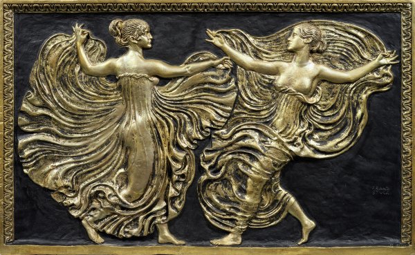 Gipsrelief, schwarz und goldfarben gefasst, 1895. R. u. im Hintergrund sign.; Das Relief entstand nach längeren Studien im Zusammenhang mit Stucks Planungen für seine eigene Villa als Gesamtkunstwerk in München. Dort verwendete er es gleich zweimal: als Gipsrelief im Musiksalon und als geringfügig größeres Bronzerelief an der Gartenmauer. Später ließ Stuck weitere Exemplare des Gipsreliefs ausführen, mit denen er auch fremde Privaträume ausstattete. Dargestellt sind zwei junge, sich gegenüberstehende Frauen, die sich in leichten, weiten Gewändern dem Tanz hingeben; während ein ornamental verzierter Rahmen das Relief auf den Seitenkanten und der oberen Kante einfasst, bleibt die untere Kante schmucklos und dient hierdurch zugleich als Standfläche der Tänzerinnen. Das Relief spiegelt sowohl Franz von Stucks Auseinandersetzung mit antiken Tanzreliefs als auch mit dem modernen, freien Tanz seiner Zeit wider. Dieser wurde seit Ende des 19. Jhs. durch die legendären Auftritte der amerikanischen Tänzerin Loïe Fuller (1862 - 1928), später auch von Isadora Duncan (1877 - 1927) propagiert. Schon seit 1892/93 machte Fuller mit ihren durch Lichteffekte eindrucksvoll verstärkten Serpentinentänze, bei denen sie in weite, weiße Schleierkostüme gehüllt war, in Paris Furore, inspirierte zahlreiche Künstler. Auch wenn Franz Stuck die Tänze der Fuller nicht im Original gesehen haben mag, so waren ihm diese sicherlich durch Berichte, Fotografien und Werke anderer Künstler bekannt. Die Tänze Fullers und Duncans entsprachen den eigenen Vorstellungen und Interessen Stucks, denn sie waren der Ausdruck dionysischer Lebensfreude im Geist der Antike, ein Rausch der Schönheit und Sinnlichkeit. Dies setzte er beim vorliegenden flachen Relief um, das die dynamische Bewegung der beiden Tänzerinnen schildert, wobei er mit ornamentaler Linienführung, Symmetrien und Asymmetrien spielte. Ca. 62 cm x 101 cm x 3,5 cm.