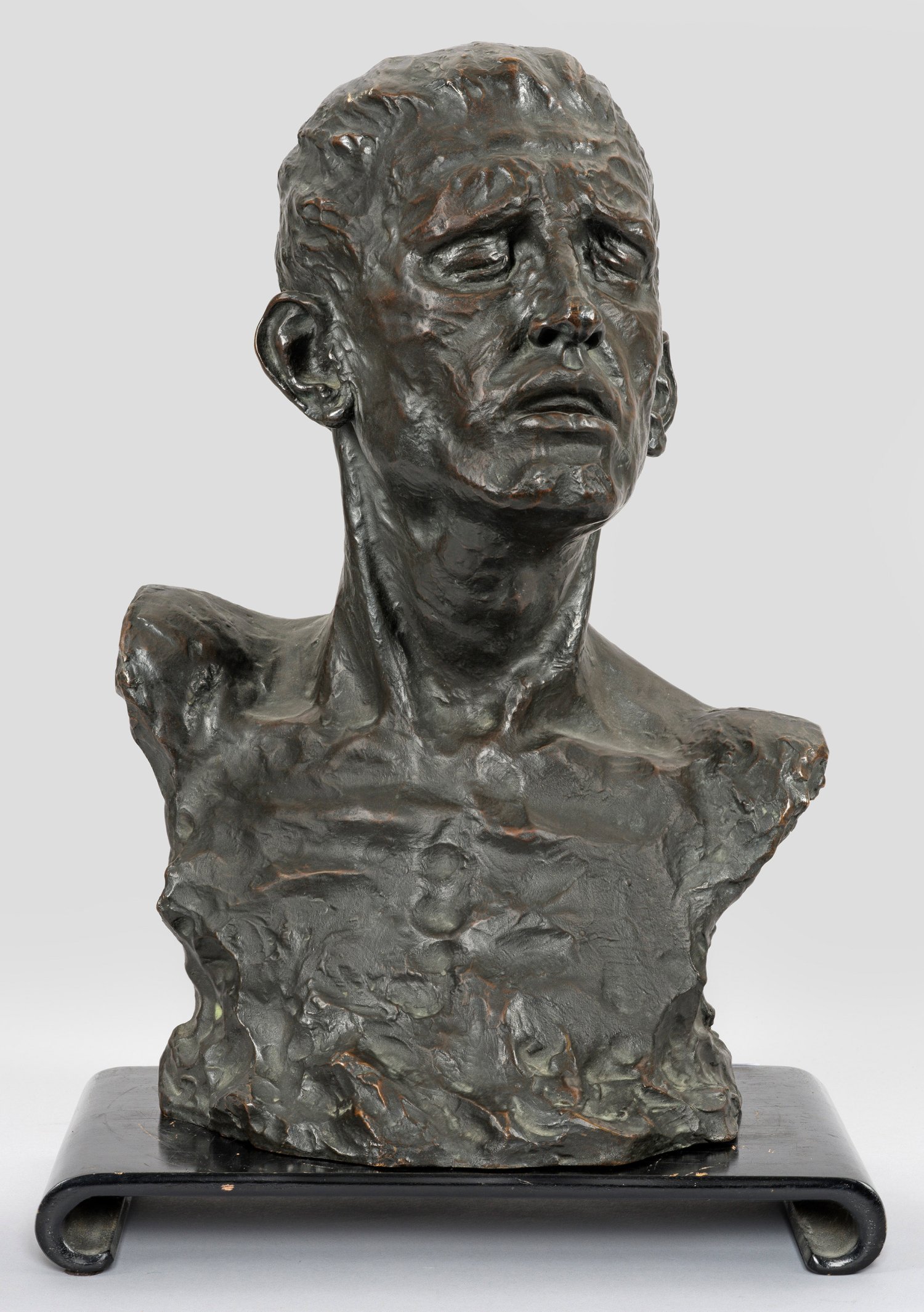 Bronze, dunkel patiniert. Ebonisierter Holzsockel. Durch Rodins Werke, insbesondere der 1884-1889 von ihm geschaffenen und 1895 erstmals in Bronze gegossenen Gruppe "Les Bourgeois de Calais" (Die Bürger von Calais) inspirierte Darstellung von expressivem Ausdruck und mit sehr lebendiger Modellierung. Bronze-H. 52 cm.