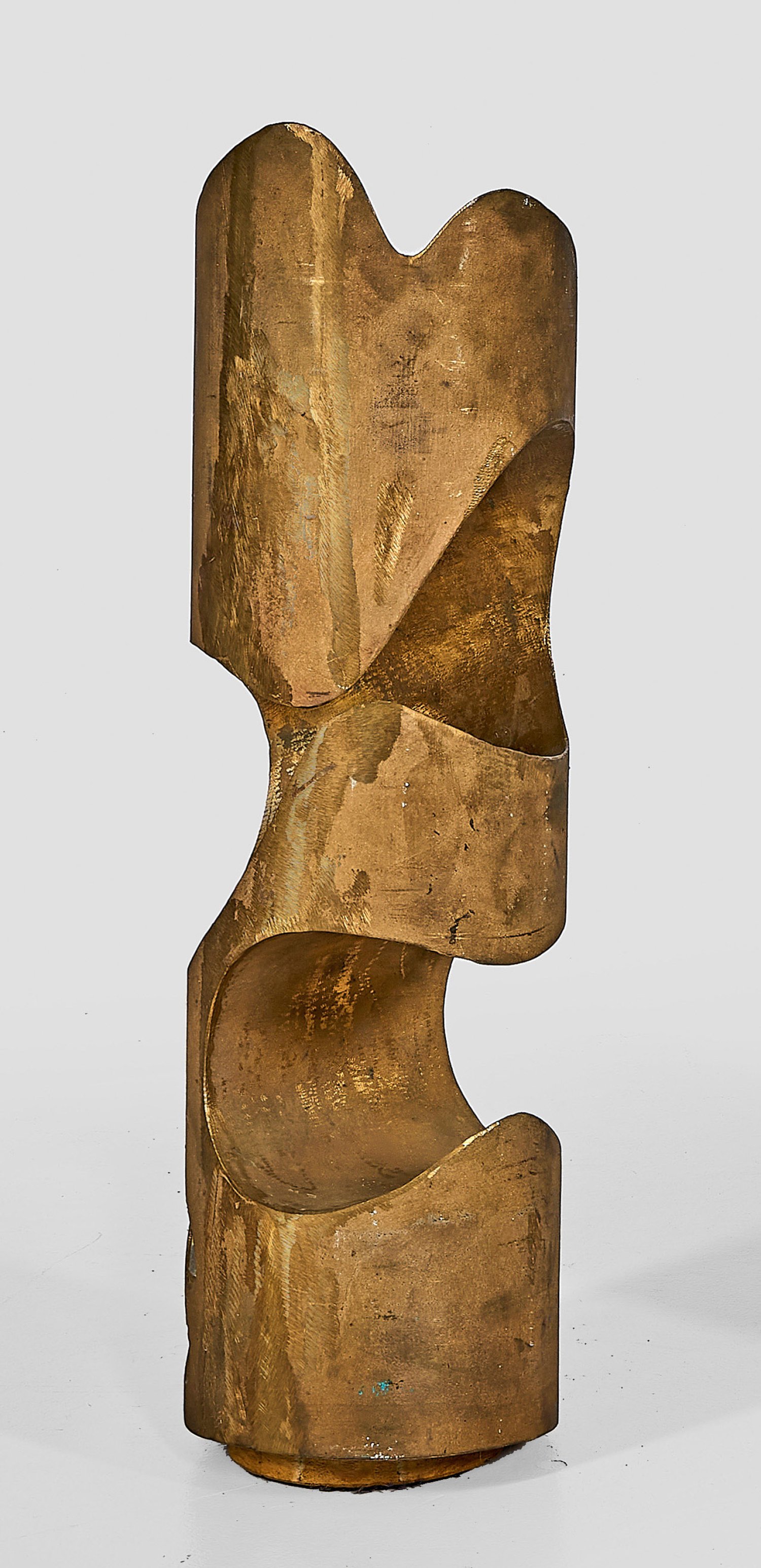 Bronze, teilw. geflext bzw. gebürstet. Montiert auf runder Holzplinthe. Abstrakte Plastik in zylindrischer Walzenform, die durch einen Durchbruch und unterschiedliche Einschnitte strukturiert wird. Bronze-H. 60,8 cm; Ges.-H. 62,6 cm.