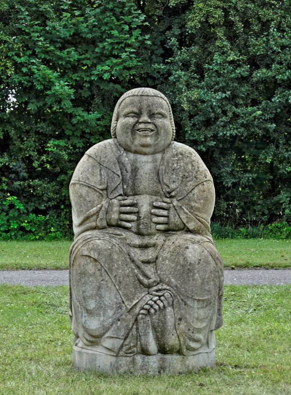 Steinguss, 1914/15. Ausführung wohl später. Vgl. Wvz. Drost Nr. 55, Der lachende Buddha basiert auf der von Hoetger selbst 1912 modellierten Keramikfigur "Licht" aus dem Zyklus "Licht und Schattenseiten", die er zwei Jahre als Steingussversion umsetzte. Die Figur zeigt einen beleibten, buddhistischen Mönch bzw. Buddha, der auf einem Sockel sitzend wiedergegeben ist und mit seinem ansteckenden Lachen und den vor dem Bauch gehaltenen Händen eine überschäumende Heiterkeit ausdrückt. Offensichtlich wurde Hoetger hierzu von einer Glücksgott-Figur des halblegendären Mönchs Budai aus China oder Japan inspiriert. 1914 zog Hoetger nach Worpswede, wo er 1915 begann, sich ein eigenes Wohnhaus - den "Brunnenhof" - mit einem Garten (den heutigen "Diedrichshof" der Bremer Heimstiftung) zu gestalten. Der "Brunnenhof" wurde zu einem einzigartigen Gesamtkunstwerk-Ensemble aus Architektur, Innenarchitektur, Malerei, Bildhauerei, Gartenkunst und Kunsthandwerk. Für den Garten ließ Hoetger Zweitgüsse seiner Plastiken für den Darmstädter Platanenhains ausführen, überdies wählte er aus dem Zyklus "Licht und Schattenseiten" die Figuren "Wut", "Rache" und "Licht" aus, um diese als Steingussplastiken dem Zweck entsprechend zu vergrößern. Zwar brannte der "Brunnenhof" 1923 bis auf die Grundmauern ab, doch blieben die Skulpturen im heutigen "Hoetger-Garten" bis heute erhalten. Ein weiteres Steingussexemplar befindet sich an exponierter Stelle in der Mitte von Worpswede im Hoetger-Ensemble des kleinen Parks vor dem "Kaffee Worpswede" und der "Großen Kunstschau". H. 150 cm.