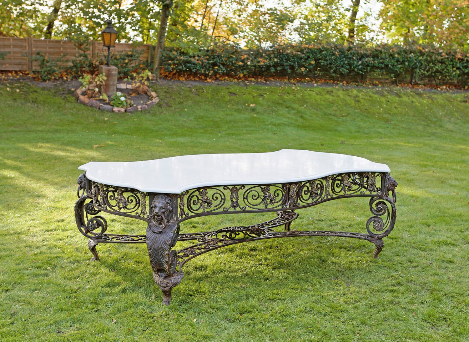 Schmiedeeisen und Bronze sowie weißer, hellgrau gemaserter Marmor. Passig geschweifte, durchbrochen gearbeitete Zarge aus Ovalen mit eingerollten Voluten sowie reliefplastisch gestalteten Löwenfiguren. Auf den schräggestellten Ecken reliefplastisch gestaltete Löwenmaskarons und große Greifringe. Stark geschwungene Beine aus breiten, blattreliefierten und eingerollten Voluten mit applizierten Rosettenmotiven. Dazwischen breite, konkav eingezogen Stege mit korrespondierendem Volutendekor. Gering überstehende, profilierte Deckplatte. H. 84 cm. 260 cm x 148 cm.