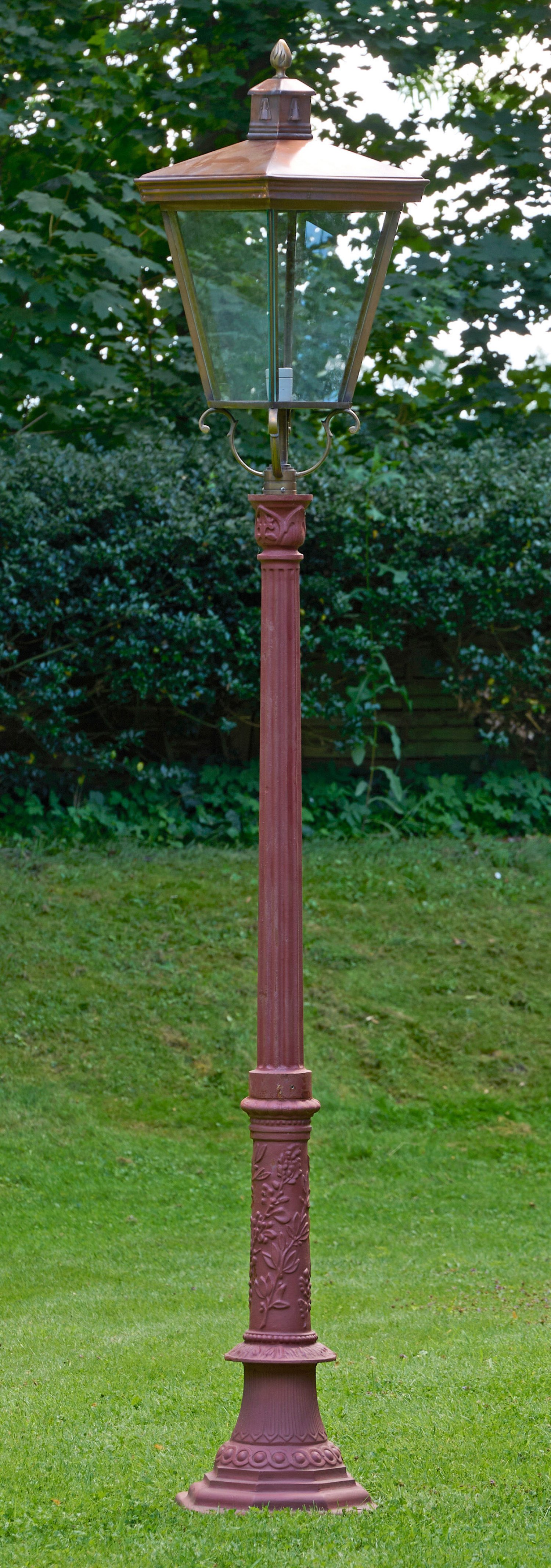 1-flg.; Gusseisen, rotbraun lackiert sowie Messing und Kupferblech. Mehrfach gegliederter, sich konisch stark verjüngender, von Blattranken umwundener Balusterschaft auf korrespondierendem Profilsockel. Oberhalb davon ausgehend geschweifte Voluten als Träger für gekanteten Leuchtkörper aus schmalen Streben mit dachförmigem Abschluss. H. 269 cm.