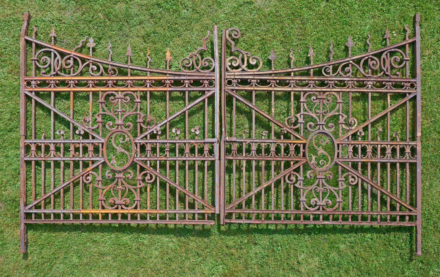 2-tlg.; Eisen. Durchbrochen gearbeitete Tore aus kräftigen, gekanteten Stegen und schmalen Stegen sowie üppigen, eingerollten und gegeneinander gestellten Volutenmotiven und C-Bögen. Geschweifter oberer Abschluss sowie Stabbekrönungen aus Wellen und Pfeilspitzen. In der Mitte großes Medaillon mit "S". Altersspuren. Je Flügel: 270 cm x 215 cm.